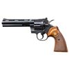 Cal. 357 Mag. S# E4309. Bbl. 6". Python double action revolver mfg. by Colt in 1969. Left side of the bbl. is marked "PYTHON 357/ * 357 MAGNUM CTG. *", with Colt's single line address marked on the right. Left side of the frame is marked with the Rampant Colt logo and "VP" proof. Metal components exhibit a polished blue finish overall, save for on the top strap of the frame and bbl., which exhibit a matte blue finish. Sides of hammer are polished in-the-white. Frame is mounted with 2-piece Colt gold medallion checkered wood grips. V/R with pinned blade front sight and adj. square notch rear sight. All serialized parts are matching and are present on the frame and cyl. crane. CONDITION: excellent, with metal components retaining virtually all of their original factory blue finish, showing some light superficial handling marks, with a small spot of wear present on the lower left edge of the bbl. Cyl. exhibits a very light to light dragline. Sides of hammer retain a bright appearance. Proper manual mechanics. Grips are very good overall, showing a few light superficial handling marks, with a chip present along the butt of the right panel. (25-6548/MLW). CURIO. $1,500-2,250.