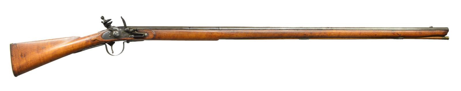 GUN BY BARNETT. Cal. 57. NSN. Trade guns by Barnett are the most common by far. The 42 1/4" octagon to round barrel has London proofs on top left flat at rear which is also stamped with the initials "JEB" and some other unknown marks. Tombstone fox stamp is on top flat and on flintlock with rounded plate fitted with reinforced cock, integral rounded pan, bridled frizzen and feather spring with dog nose finial. Tail of lock is marked "BARNETT" "LONDON" "1875". Curly oak stock extends to muzzle and is fitted with brass buttplate held by five screws, oversized trigger and steel trigger guard, as well as classic sea monster sideplate affixed by three large screws. Lockplate, sideplate and barrel tang are accented by carved moldings. Circular fox stamp is on left side of butt. Hickory ramrod with brass tip mounts through two multi beaded brass pipes and simple hole in stock as thimble. CONDITION: very fine, original "as found". Iron parts retaining nearly all of their light brown finish and show some light cleaning. Stock retains nearly all of its original finish with great attic burn and crazing. Bore is bright and shiny. Lock fine appears little used. An exceptionally fine example of one of these classic American guns. PROVENANCE: From the Lifelong Collection of Glen E. Mattox. (01-22560/MGM). ANTIQUE. $3,000-5,000.