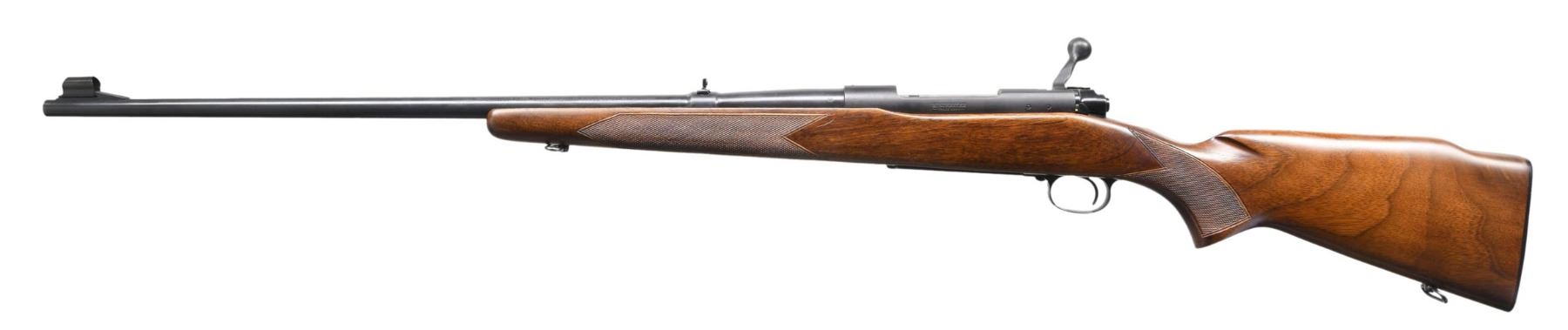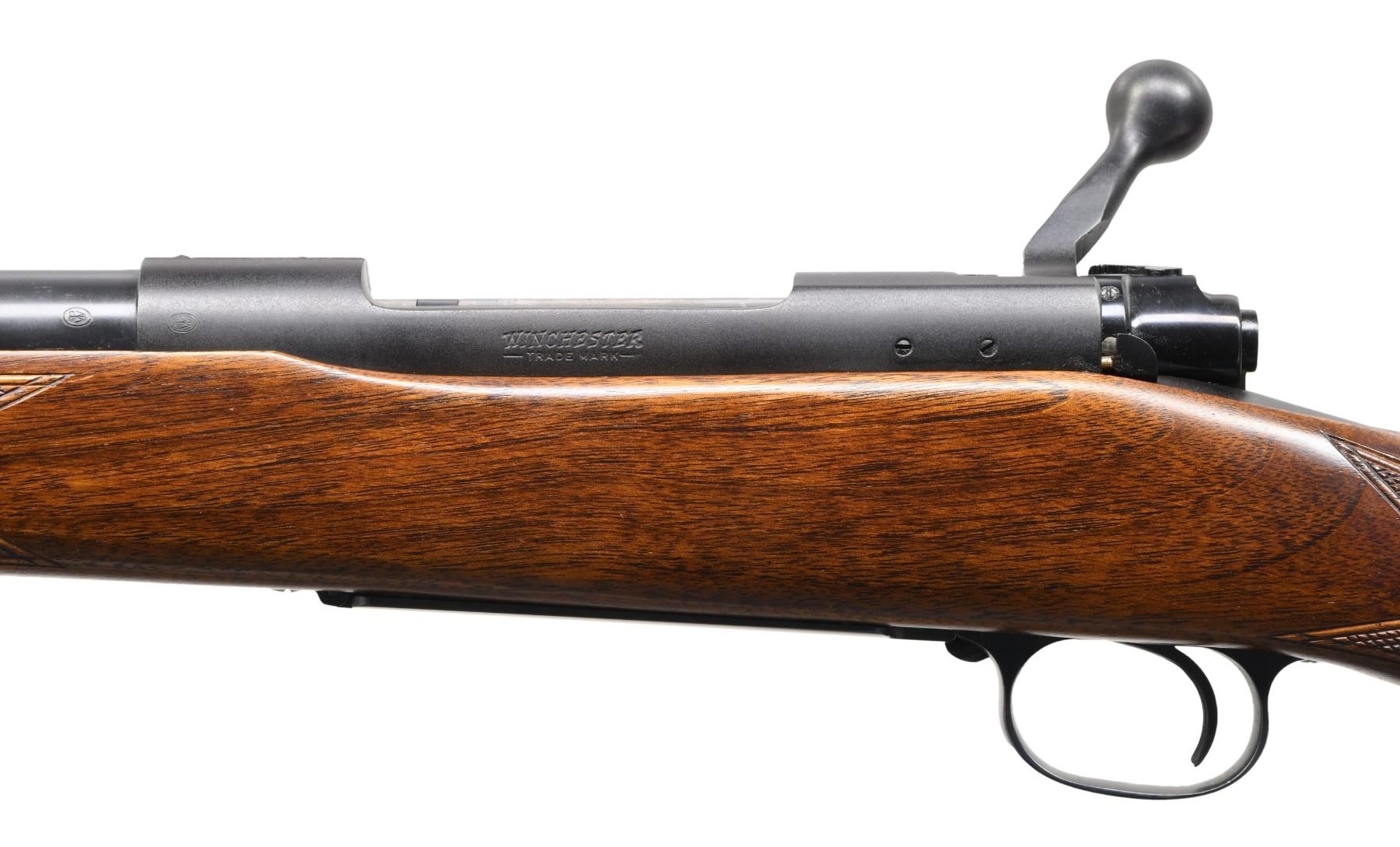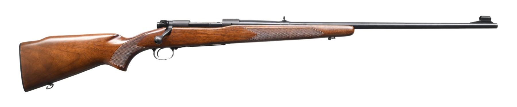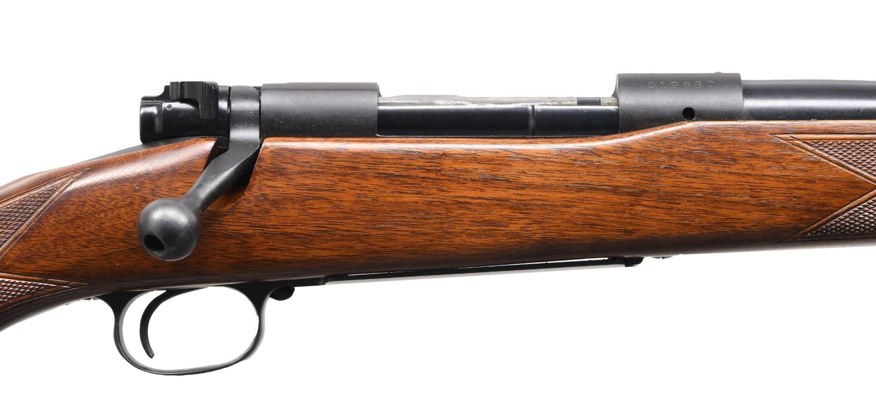 ACTION RIFLE. Cal. 264 Win Mag. S# 519680. Bbl. 26". Model 70 bolt action rifle, mfg. by Winchester in 1961. Left side of the bbl. is marked with the Winchester trademark logo, followed by the model and cal. designations. Left side of the receiver is marked with the Winchester trademark logo, with the S# marked on the right side of the chamber. Receiver exhibits a matte blue finish, with remaining metal components exhibiting a standard blue finish overall. Body body is polished in-the-white. One-piece checkered wood Monte Carlo pistol grip buttstock with flat checkered black plastic buttplate. Ramped, hooded, and aluminum beaded blade front sight, with flip-up U-notch rear sight. Receiver is drilled and tapped. CONDITION: excellent, with metal components retaining bountiful amounts of their original factory blue finish, exhibiting a few light superficial handling marks overall. Mirror bore, exhibiting well-defined rifling throughout. Wood stock shows a few superficial marks and minor impressions from handling and storage but otherwise remains excellent overall. (24-5915/MLW). CURIO. $1,500-2,000.