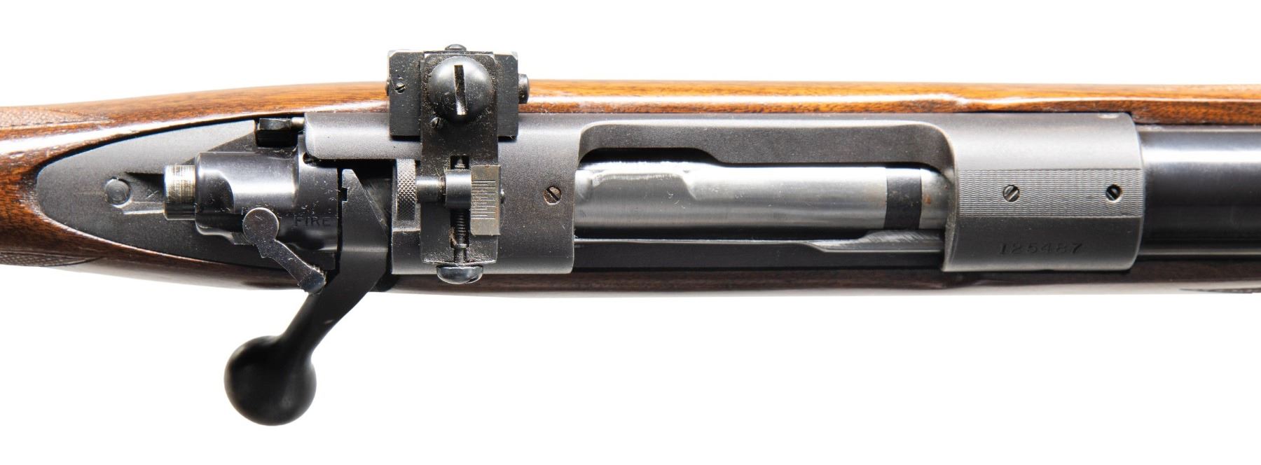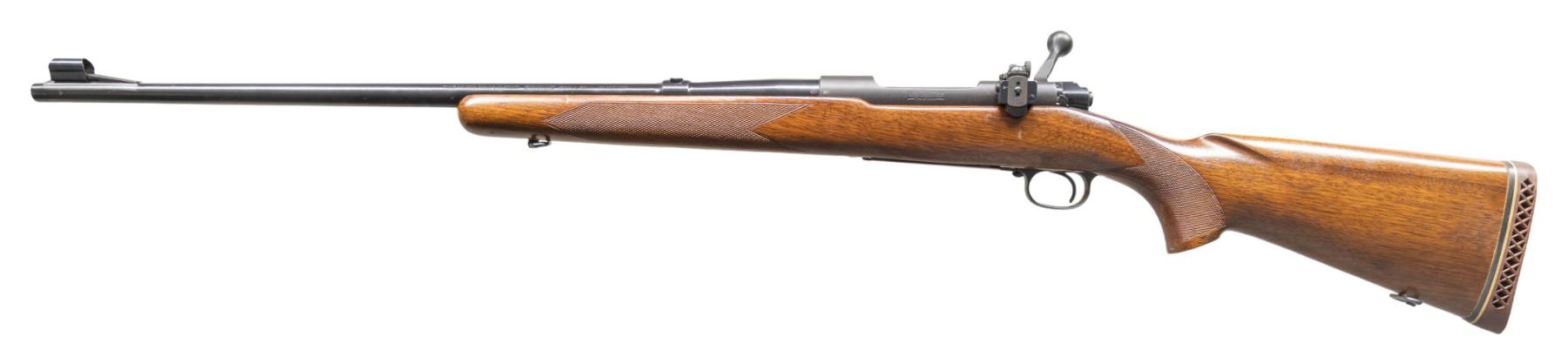 ACTION RIFLE. Cal. 30-06. S# 125487. Bbl. 24". Model 70 bolt action rifle mfg. by Winchester in 1949. Left side of the bbl. is marked with Winchester's mfg. information, as well as the model and cal. designations. Receiver exhibits a matte blue finish, with remaining metal components exhibiting a standard blue finish, save for on the bolt body, which is polished in-the-white. 1-piece checkered wood pistol grip stock with added oversized black spacer and Pachmayr red rubber recoil pad. Toeline of buttstock and underside of forearm are fitted with sling swivels. Ramped, hooded, and aluminum beaded blade front sight, with blank in rear dovetail, and receiver mounted Lyman 57WJS adj. aperture rear sight. Receiver is factory drilled and tapped. Bolt matches the receiver via the full S#, which is electro-penciled on the underside. CONDITION: metal components retain the vast majority of their original factory blue finish, exhibiting some light edge wear and a few superficial handling marks overall. Bbl. and trigger guard bow exhibit some small scattered spots of light to mild pitting and finish loss. Near mirror bore, exhibiting some light pitting and a small concentrated spot of dark pitting towards the muzzle, while retaining well defined rifling throughout. Proper manual mechanics. Wood furniture shows some scattered superficial handling marks and minor impressions, but otherwise remains very good overall. Front strap of pistol grip shows some spots of finish loss. (25-4755/MLW). CURIO. $700-1,000.