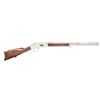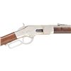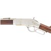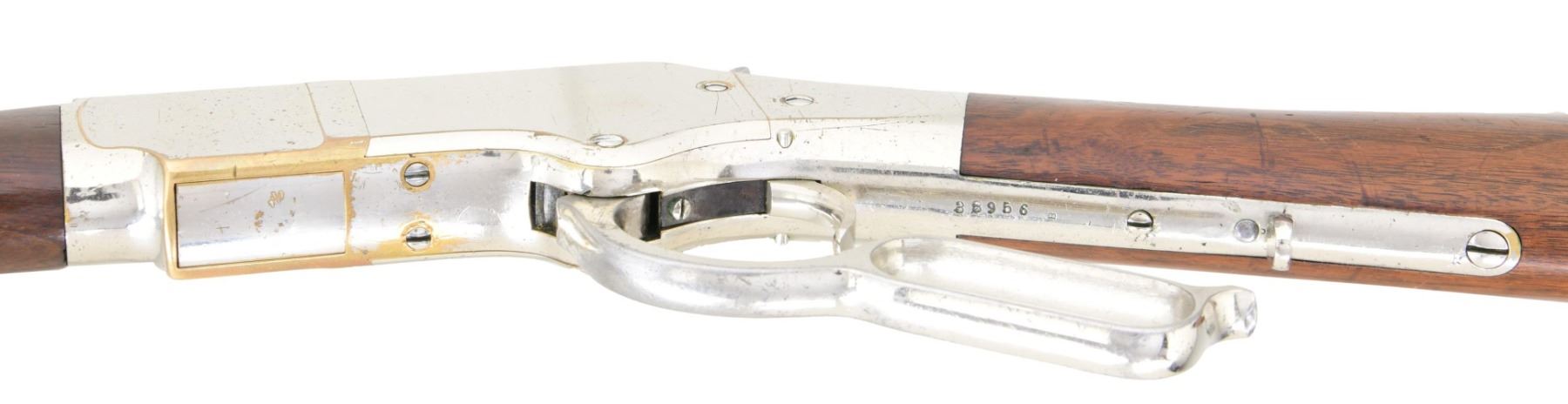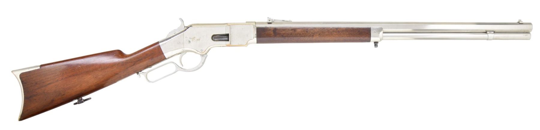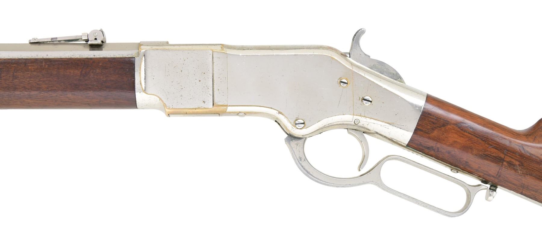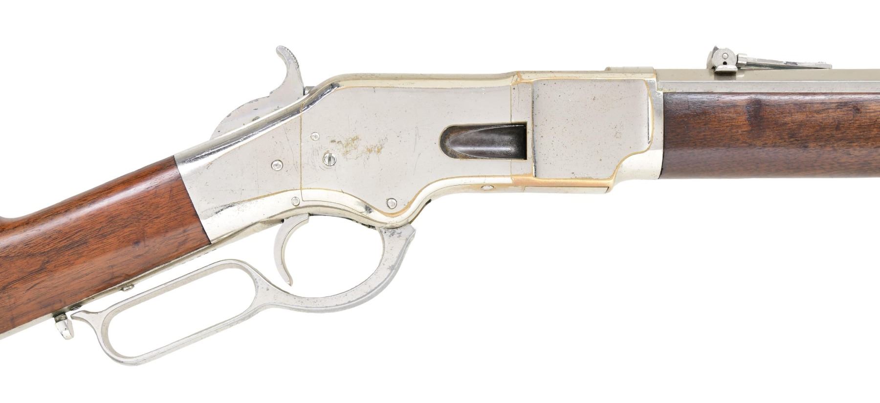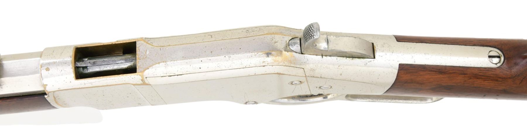 MODEL LEVER ACTION RIFLE. Cal. 44 HRF. S# 38956. Bbl. 24" octagon. Beaded blade front sight w/ sporting leaf rear sight. Full length mag. Full nickel finish. Walnut forearm & straight grip stock w/ nickel finished crescent brass trapdoor buttplate. Toeline of stock has sling swivel w/ swivel base remaining only on forearm cap. 1870 mfg. UNATTACHED ACCESSORIES: 4 piece cleaning rod held in stock compartment. CONDITION: over 85% original nickel finish showing edge & carry wear w/ numerous light scratches & marks on the action. Stock has original finish showing numerous scratches, marks & small dents w/ wear spots. Sound action. Dark lightly pitted bore w/ worn rifling. (01-25631/DS). ANTIQUE. $40,000-50,000.