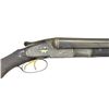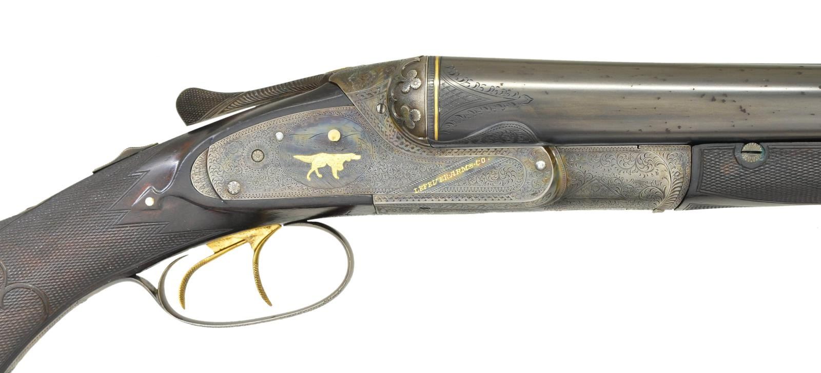 Cal. 10 Ga., 2 7/8". S# 11875. This is a very high grade Lefever however it appears that there has been some further embellishment to make it look like a later Optimus grade with the addition of some gold. The 28" barrels fitted with flat matted rib holding two white beads are gold inlaid "Lefever Arms Co." "Whitworth Fluid Steel" on tops. There are gold bands around breech ends and engraved triangles in front of bands. Barrels have usual Lefever style ogees at jucture of action. Bottoms of barrels are stamped with British provisional proofs, left barrel with S#. Case hardened early semi sidelock action has later factory fitted in frame ejectors, locking mechanism and cocking hook. Watertable is stamped with S# and engraved "Optimus". Action is nicely filed with concave beads around bottom, dual shamrock fences, rebated lock tails and flutes on top lever. Action and lockplates are engraved with near full coverage, well cut scroll within line and geometric borders. Lockplates are near fully engraved with exceptional small scroll with floral highlights and very intricate geometric borders. This fine engraving surrounds game scenes with dogs in flush inlaid in gold. Pointing pointer on left, setter on right. "LEFEVER ARMS CO." is in gold on diagonal slashes at the front of each lockplate. Bottom of action has engraved portrait of two dogs, their collars are linked by a inlaid gold chain. Patent dates are on trigger plate. A relief gold quail is flying on top lever pivot. A gold setter is on trigger guard bow, S# is in gold on tang which extends to fluted horn grip cap. Capped pistol grip buttstock of well marbled and figured European walnut measures 14 1/8" over brown partial leather covered pad. Early style arrowhead drop points have white dot accents. Multi point pattern checkering has fleur de lis and ribbons through grip. Flourishes extend toward comb (checkering is more closely spaced). A vacant gold shield is on toeline. Removal of grip cap show old pencil notation of S# and "OPT" which is very faint. Matching splinter forend has central push button release with spaniels head gold inlaid on button. Tip is of relief carved horn. There are early style forend ejector pivot screws present, forend iron most likely replaced at time of factory rebuild. MEASUREMENTS: BBLS: Bore Diameter: L .779". R .778". Restriction: L .002" (IC). R .000" (Cyl). Wall thickness: L .042". R .042". STOCK: DAH: 3 38". DAC: 2". CAST: neutral. LOP: 14 1/8". WEIGHT: 8 lb. 7 oz. CONDITION: fine as refurbished. Barrels retaining nearly all of a good quality reblack over some scattered pitting that was not filed out during preparation. Barrel engraving recut. Gold inlay probably new. Case hardening on action and lockplates show silvering at normal wear points. High grade engraving remains very fine, gold dogs possibly added along with gold collar chain on bottom of action. Renewed gold plating is on triggers. Gold name on lockplates and S# on trigger guard tang look original. Stocks retain most of an oil refinish over a large number of nicks and dings. Checkering recut. Shiny bores, mechanically good. (01-22754/MGM). ANTIQUE. $10,000-20,000.