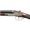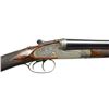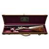 EJECTOR DOUBLE TRIGGER GAME GUN WITH CASE & ACCESSORIES. Cal. 12 Ga., 2 5/8". S# 18642. (CA 1945). The 28" chopper lump barrels fitted with narrow swamped game rib are engraved "Steven Grant & Sons." "7 Bury Street, St. James's, London, England" on tops. Barrel flats are stamped with London nitro proofs for 2 3/4" chambers (2 5/8" is actual measure). Bottoms of barrels are stamped with S#'s. Case hardened sidelock action is stocked to the fences and is nicely filed, fences having classic Steven Grant ellipses. Action features automatic safety ("SAFE" inlaid in gold), bushed strikers and double triggers. Action and lockplates are engraved with near full coverage, well cut scroll within small scroll borders. "Steven Grant & Sons" is on each lockplate. Blued top lever and trigger guard are engraved to match. S# is on short trigger guard tang. Very attractive straight grip buttstock of finely fiddle figured and well marbled European walnut measures 15" over checkered wood butt and features drop points, well cut flat top checkering with mullered borders at grip and gold oval on toeline engraved "NEJ". Matching splinter ejector forend has Anson release. MEASUREMENTS: BBLS: Bore Diameter: L .728". R .729. Restriction: L .019" (Mod). R .011" (IC). Wall thickness: L .027". R .028". STOCK: DAH: 2 1/16". DAC: 1 1/2". CAST: about 1/4" off. LOP: 15". WEIGHT: 6 lb. 10 oz. UNATTACHED ACCESSORIES: gun is housed in what appears to be its original VC leather case with stitched leather corners. Top is embossed J.P.R.H. Interior is lined in burgundy cloth and has green leather gold embossed "Atkin, Grant & Lang" label in lid which has "7 Bury St" address. Case contains relatively new black nylon and brass cleaning rod with brush, mop and jag. "Grant & Lang" marked round oil bottle, snap caps and 2 keys. CONDITION: very fine, showing some very light refinishing of wood. Barrels retaining over 95% original blue with some light splotches and some scattered marks. Action retains about 60% case hardening color, lightly silvered on beads, fences and bottom. Lock plates retain nearly all of their original color. Top lever and trigger guard show light silvering. Stocks appear to have a very light oil refinish with sharp edges around locks and drop points slightly rounded. Checkering does not appear to be re cut. Bores are bright and shiny without any noted problems. Exterior shows reblued ding on right side of barrel about 8 1/2" in front of breech face. Action is tight, barrels are on face, ejectors are strong and in time. Case leather shows a good scattering of marks and rubs but is still fine, original straps and handle are good, interior cloth is fine with marks and rubs and is a bit dusty, label is very fine. A very fine gun that measures well. (22-5838/MGM). CURIO. $12,000-18,000.