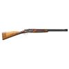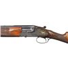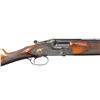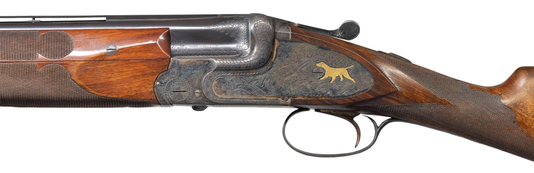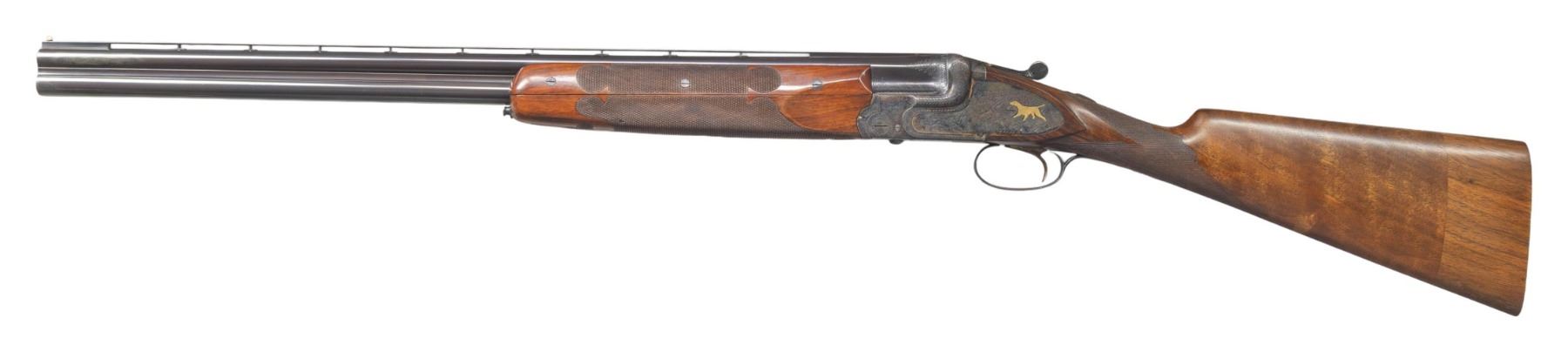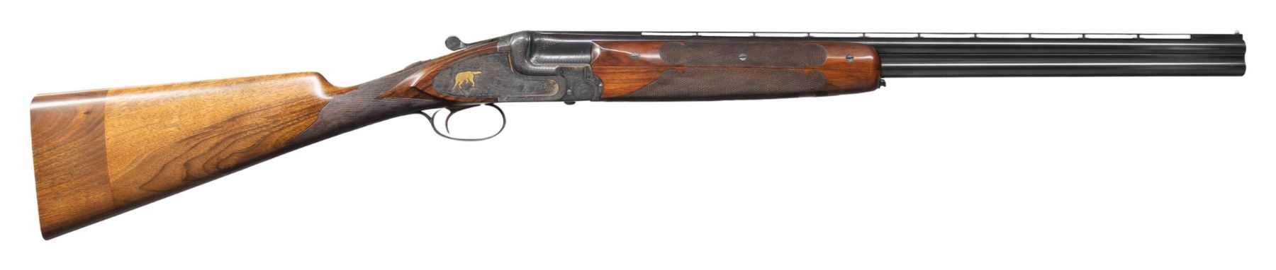 SINGLE TRIGGER GAME GUN. Cal. 20 Ga. 2-3/4". S# 48076. The 25-5/8" demi-bloc O/U barrels are fitted with narrow matted ventilated rib. Top barrel is engraved "For Frank Pugliese" "Trenton N.J." either side of rib. Left ejector housing is engraved "MADE IN BELGIUM". Bottoms of barrels are stamped with 1937 Belgian nitro proofs for 2-3/4" chambers. Case hardened side plated boxlock action features non-automatic safety, double top bolt third fastener and gold plated Miller single selective trigger. Action and lockplates are engraved with near full coverage nicely cut and shaded varying size scroll as counterpoint to game scenes with dogs inlaid in gold and engraved with Bulino highlights. Left lockplate has flushing ducks at front with an alert pointer at rear; right side has quail at front with setter turning to scent and about to point. No signature found. Somewhat fiddle figured European walnut straight grip buttstock measure 14-1/4" over checkered wood butt on 2-1/2" plain American walnut extension. Stock also appears to have been converted to straight grip with checkering re-cut in area of removal. Trigger guard tang is very short and unengraved. Matching three piece ejector forend has fleur-de-lis checkering and Anson release. MEASUREMENTS: BBLS: Bore Diameter: O .635. U .632. Restriction: O .032 (full). U .027 (mod). Wall thickness: O .027. U .024. STOCK: DAH: 2-1/4". DAC: 1-1/2". CAST: about 1/4" off. LOP: 14-1/4". WEIGHT: 6 lb. 9 oz. CONDITION: very fine. Original except for stock modification. Metal retaining over 90% original finishes. Buttstock partially refinished with addition of lengthening piece and removal of pistol grip. Bores are bright and shiny. Action is tight. Ejectors are strong. Trigger works well. PROVENANCE: Estate of Lloyd Robinson. (25-6675/MGM). MODERN. $1,750-2,500.