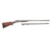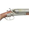 STUTTGART WITH EXTRA 10 BORE BARREL SET. Cal. 8 Bore, approx. 3 1/4" / 10 Bore, 2 7/8". NSN. The 32" fine 3 stripe Damascus 8 ga. bbls. are engraved “G. WILCKE STUTTGART” on slightly raised game rib with extension. Bbl. flats are stamped with Belgian black powder proofs and “NON POUR BALLE”. The 28" 10 bore bbls. are similarly marked on rib and bbl. flats except there is no choke marking. Round bodied large size top lever action is fitted with front spring sidelocks with round bodied serpentine rebounding hammers with tall thumb spurs. Action and locks are engraved with full coverage very nicely cut varying size shaded scroll within scroll and geometric borders. Action features dual underlugs and crossbolt 3rd fastener and double triggers. Capped pistolgrip buttstock of nicely fiddle figured and lightly streaked European walnut measures 14 1/4" over steel buttplate. Gripcap is horn and point pattern checkering is at grip. Matching splinter forend has Anson release. MEASUREMENTS: 8 BORE BBLS: Bore Diameter: R .805", L .805". Restriction: R .038" (FULL), L.040" (FULL). Min. Wall Thickness: R .045", L .040". STOCK: DAH: 2 1/2". DAC: 1 1/2". WEIGHT: 10 lb. 10 BORE BBLS: Bore Diameter: R .770", L .770". Restriction: R 0 (CYL), L 0 (CYL). Min. Wall Thickness: R .050", L .047". STOCK: DAH: 2 1/2". DAC: 1 1/2". LOP: 14 1/4". CAST: neutral. WEIGHT: 9 lb. 12 oz. UNATTACHED ACCESSORIES: extra bbl. set. CONDITION: good as partially refinished. Both bbl. sets retaining over 90% of a good quality rebrown with excellent definition to pattern. This fine finish is over some light pitting noted on 10 ga. bbls. Action is mostly pewter gray with some scattered dark patches of light pitting. Stocks retain most of an older oil refinish. Sharp edges rounded. Checkering recut. Wood is somewhat under metal on action and locks and forend iron. Bores are lightly pitted throughout, but have been polished and are shiny. Action is loose with both barrel sets and needs attention. 10 Ga. barrels feel relatively tight with forend in place. Top lever needs to be held to right for barrels to close. Locks are good. (01-21833/MGM). ANTIQUE. $1,750-2,750.