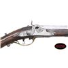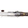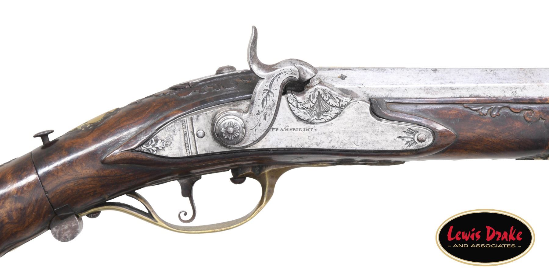 OF BRESCIA CONVERTED TO PERCUSSION WITH BARREL BY GIESU MUTTI. Cal. 60. S# NSN. 20-1/2" barrel with octagonal rear section transitions to round through wedding band and then to laterally ovate muzzle that measures 1-7/8" across. There are two large and nine small poincon at breech end; one marked for Giesu Mutti working in Gardone around 1750. Barrel is converted to percussion with large fancy drum and nipple. Lock with thick flat plate having rebated tail is marked "FRAN*BIGONI*" (Franco working in Brescia 1740-80). A heavy flat faced hammer has been installed. Very fine raised floral chasing is at rear of lockplate. Folding stock of fancy grain Italian walnut has push button detent at top of grip and hinge at bottom. There are raised mouldings around all flush brass mounts. Foliate carving highlights finials of buttplate, rear of trigger guard and barrel tang. Furniture finials and sideplate are of fancy form. A 6" belt hook is affixed to left side of stock. CONDITION: good. Iron cleaned to silver gray. Brass is nicely toned. Wood exhibits most of its old finish with many marks and dings. Fore part of stock professionally restored from thimble to muzzle. Bore is rusted. Lock operable. PROVENANCE: from the renowned collection of quality sporting arms from Lewis Drake together with inventory of Lewis Drake Associates. (01-26106/MGM). ANTIQUE. $2,000-4,000.