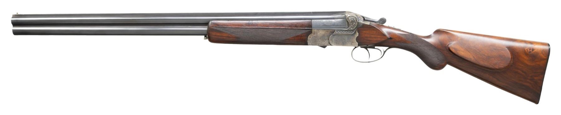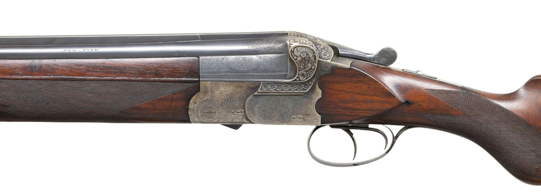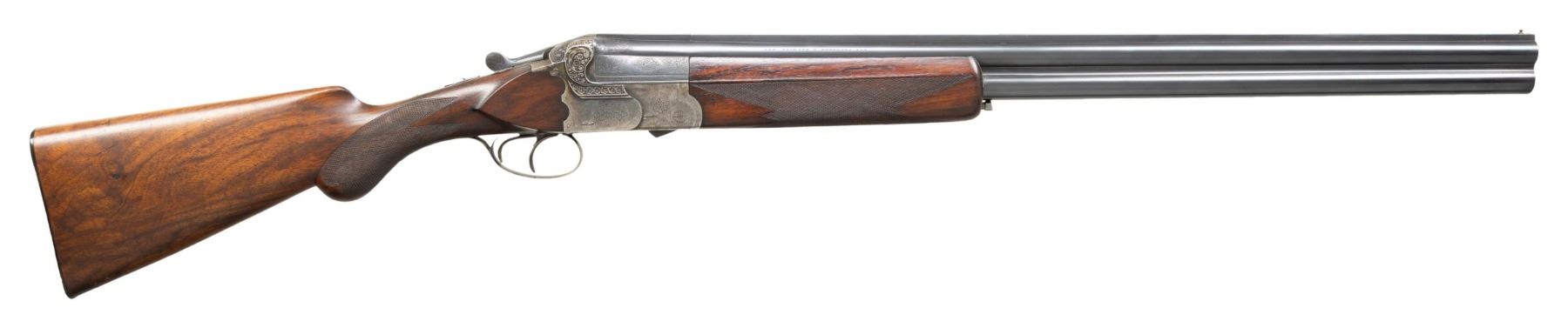 Cal. 12 Ga. 2-5/8". S# 29268. These very well made and at the time, quite expensive shotguns were retailed by VL&D and A&F through the 1920's -30's. This fine gun has 26" demi-bloc barrels fitted with full length solid matted rib. VL&D info is engraved on right side of top barrel with "NEW-YORK" on left. Ejector housings are engraved with rose and scroll. Barrels are stamped with German nitro proofs with last number of proof date visible being "24". Case hardened double Kirsten O/U scallop back boxlock action features automatic tang safety and double triggers (front articulated). Action is engraved with 80% coverage lightly cut rose and scroll with maker's name on each side. Fences are beautifully deep relief chiseled with an interplay of scrolls surrounding blossoms of roses and poppys (?). Trigger guard is of steel engraved to match action. S# is on short tang. Round knob pistol grip buttstock made of well marbled European walnut measures 14" over original ribbed horn buttplate. Stock features shadow line right hand cheekpiece, point pattern grip checkering and inset horn lozenge shaped drop points. Matching deep one piece ejector forend has Anson type release. MEASUREMENTS: BBLS: Bore Diameter: O .724. U .725. Restriction: O .029 (IMod). U .019 (Mod). Wall thickness: O .021. U .030. STOCK: DAH: 2-5/8". DAC: 1-7/16". CAST: about 1/4" off. LOP: 14". WEIGHT: 7 lb. 4 oz. CONDITION: very fine. Barrels retaining over 80% of what appears to be original blue but is probably a "best" old re-blue. Action retains about 60% original case hardening color; strong where protected. Stocks retain nearly all of what appears to be their original oil finish. Checkering lightly worn. Bores are bright and shiny without noted problems. Action is tight; mechanically fine. (25-5029/MGM). CURIO. $1,500-2,250.