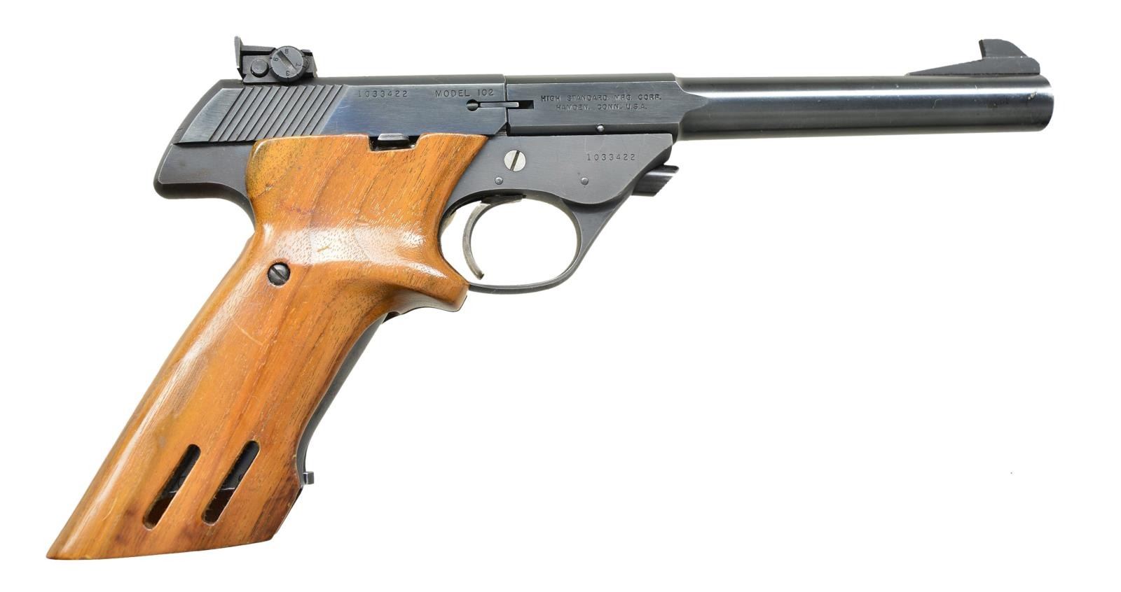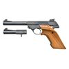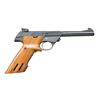 PISTOL. Cal. 22LR. S# 1033422. Bbl. 6.75" Heavy. Mfg. 1959. Very desirable self-loading rimfire target pistol. Push button, quick change barrel. Bright blued finish on barrel & slide w/ matte black finish on frame. Bull barrel w/ adjustable target sights. Serrated slide w/ left-side thumb safety. 2 piece target style hardwood grips w/ left side thumb shelf. Bottom mag release. Extremely light trigger w/ no over-travel. MAGS: 1 steel 10-rd. UNATTACHED ACCESSORIES: Spare 4.5" bull barrel & brown leather pistol rug. CONDITION: Finish coverage is complete & consistent w/ some thinning on barrel. Frame illustrates some drag lines Grips demonstrate some impressions & finish thinning from use. Bright bore w/ descent rifling on both barrels. (22-5292/JZ). CURIO. $300-450.