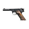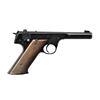 Cal. 22 LR. S# 204965. Bbl. 4.5". Manufactured 1947. Serrated slide. Blade front & drift adjustable rear sights. Blued finish. Exposed hammer w/ checkered spur. Bottom magazine release. Smooth front & back straps. Checkered wood grips w/ left side thumb rest. MAGS: 1 steel 10 rd. CONDITION: complete & consistent blued finish w/ some thinning, primarily on high spots & at muzzle. Bright bore w/ strong rifling. (22-5982/JZ). CURIO. $350-550.