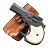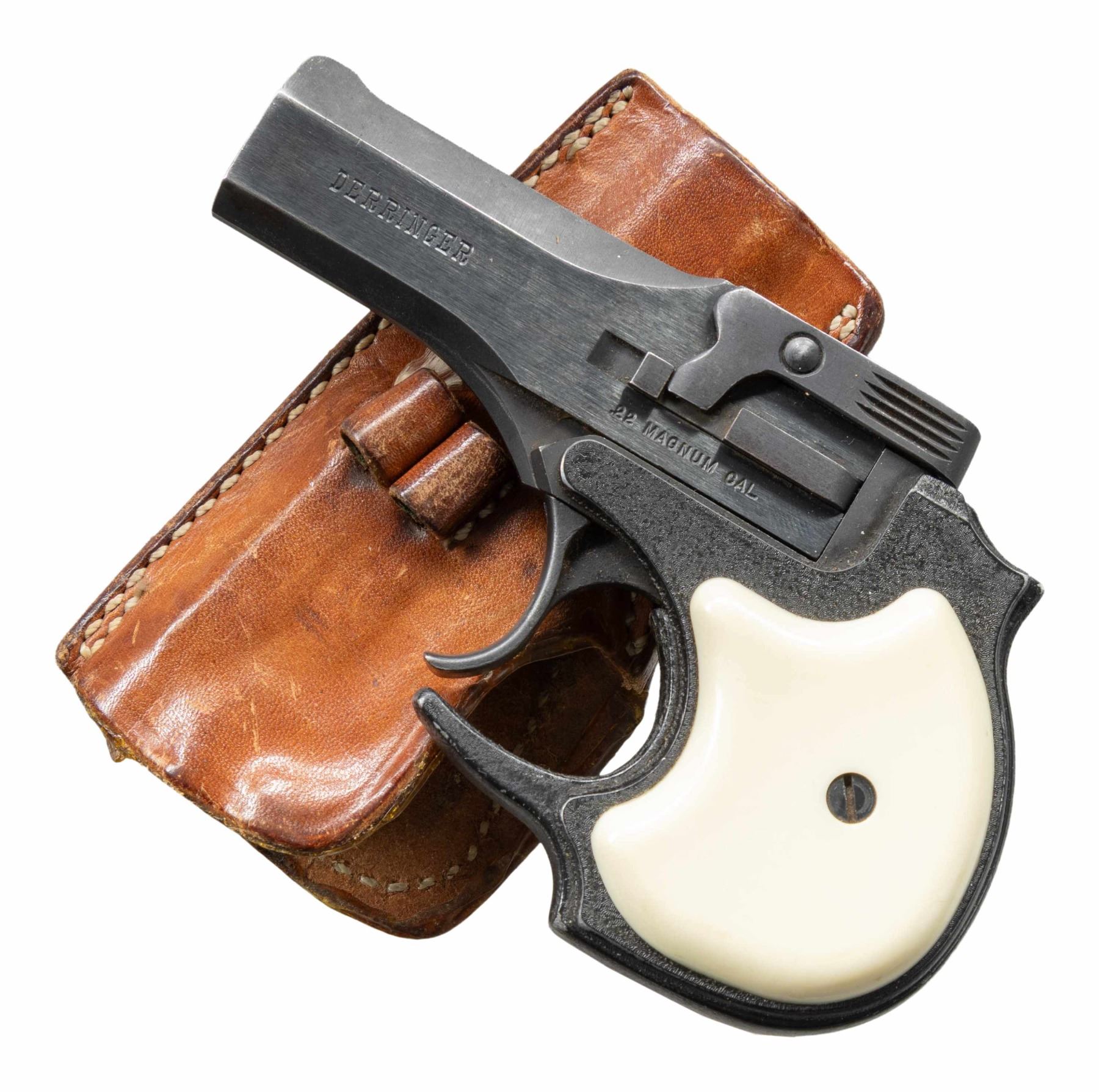 Cal. 22 Mag. S# 2482181. Bbl. 3 1/2". (Model DM-101) O/U derringer pistol mfg. by High Standard. Left side of the bbl. is marked "DERRINGER", followed by the cal. designation, with High Standard's mfg. information marked on the right. Alloy frame exhibits a black "wrinkle" finish, with steel components exhibiting a blue finish. Frame is mounted with 2-piece plain white plastic grips. Integral blade front sight with square notch rear sight on bbl. latch. UNATTACHED ACCESSORIES: Safariland brown leather holster marked "57/ HI STD." on the rear. CONDITION: metal components retain the majority of their original factory finishes, exhibiting some light to mild edge wear overall. Mirror bores, retaining well defined rifling throughout. Proper manual mechanics. Grips show light superficial handling marks, but otherwise remain sound. Holster remains malleable, exhibiting wear, discoloration, and some light crazing. PROVENANCE: The Esteemed Norm Greenberg Collection. (25-4194/MLW). MODERN. $100-200.