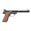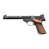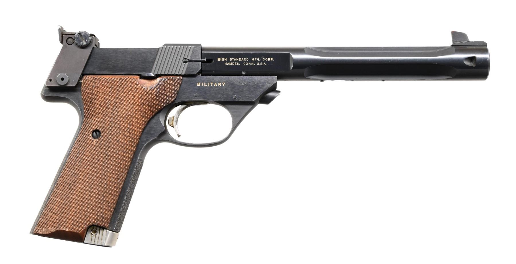 MILITARY TARGET PISTOL. Cal. 22 LR. S# 2453154. Bbl. 7 1/4", fluted. Patridge front with adj. bridge type rear sight. Grooved nickel finished adj. trigger w/ trigger stop. Stippled grip straps. Marking has gold highlighter. Checkered walnut 2-piece thumbrest grips. MAGS: one detachable 10 rd. CONDITION: Over 90% blue, showing slight carry and edge wear. Trigger finish shows spotted corrosion. Right grip panel has small chip at butt. Very good, bright bore. (24-5565/DS). MODERN. $400-600.