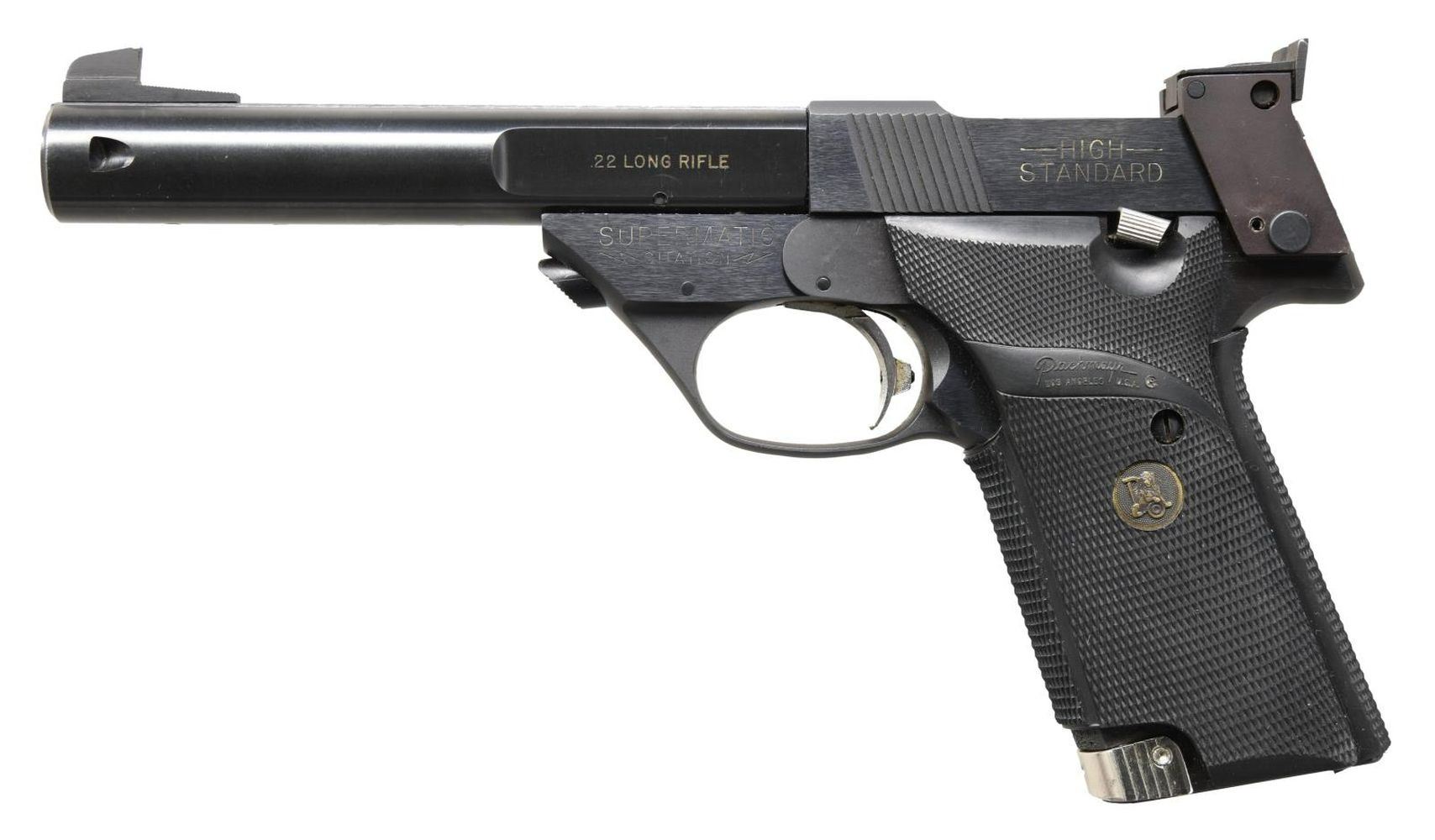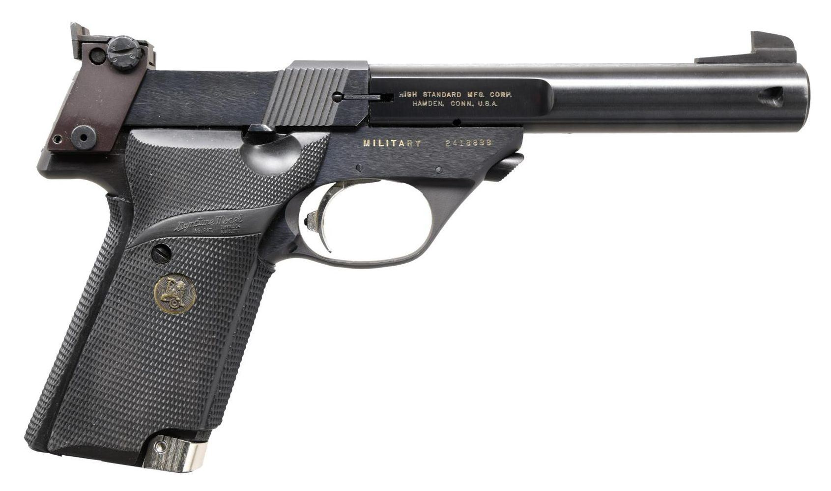 SEMI-AUTOMATIC PISTOL. Cal. 22 LR. S# 2418899. Bbl. 5 1/2". Supermatic Military Model semi-automatic pistol mfg. by High Standard in Hamden, CT. The left side of the bbl. exhibits the cal. designation, w/ "-HIGH-/ STANDARD" on the slide, and "SUPERMATIC/ CITATION" on the frame. Right side of bbl. is marked w/ High Standard's mfg. information, w/ "MILITARY" followed by the S# on the right side of the frame. Major metal components are blued, w/the trigger & mag. release being chromed. Frame is mounted w/ a 1 piece Pachmayr Signature Model black rubber grip. Matching numbers are present on the frame & slide. MAGS: 1 10-rd. CONDITION: metal components retain the majority of their original factory blue finish,exhibiting some light superficial marks from storage & handling, as well as a couple spots of extremely light edge wear. Mirror bore, exhibiting well defined rifling throughout. Grip is very good overall. (23-5435/MLW). CURIO. $450-650.