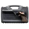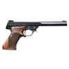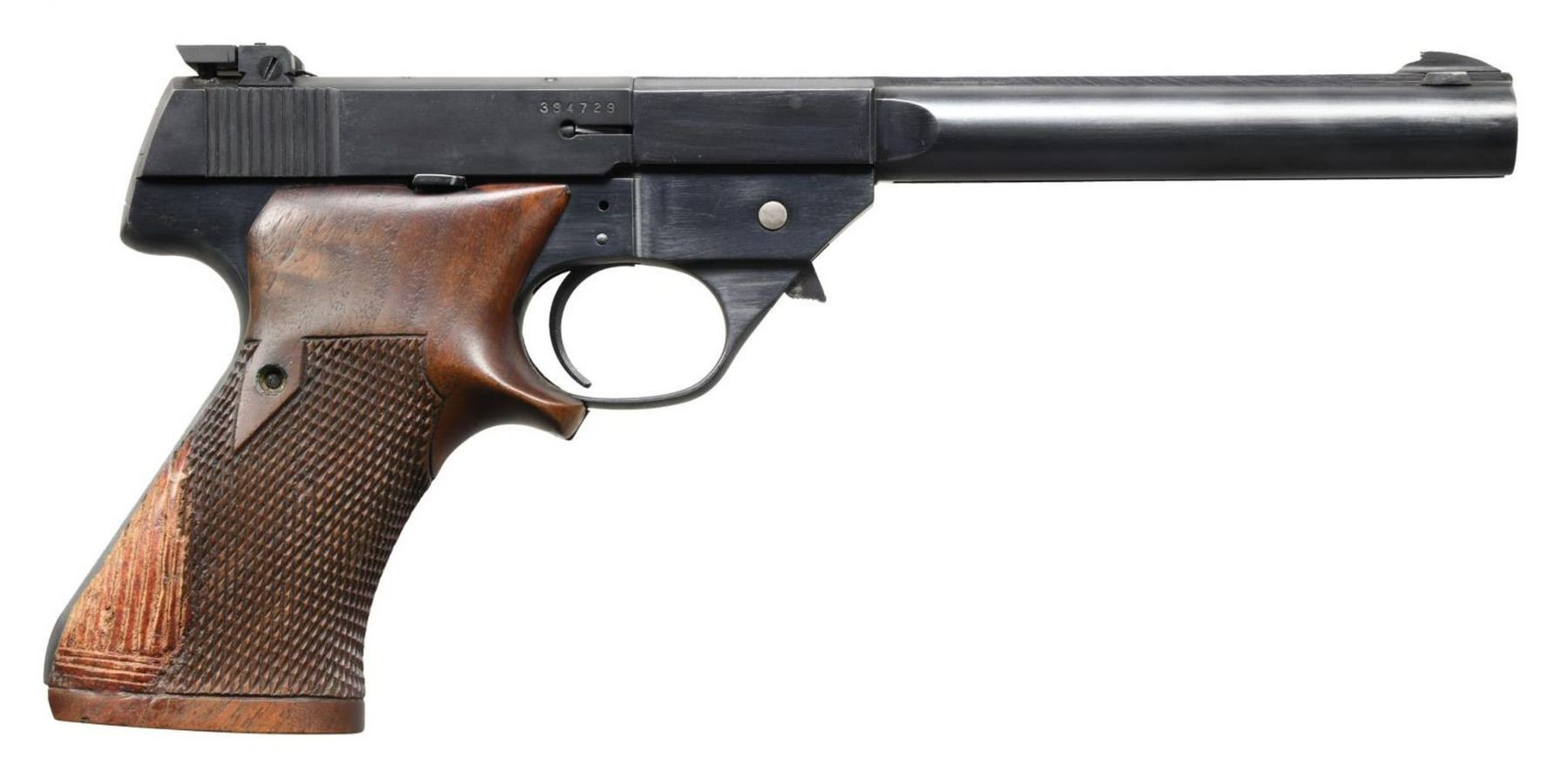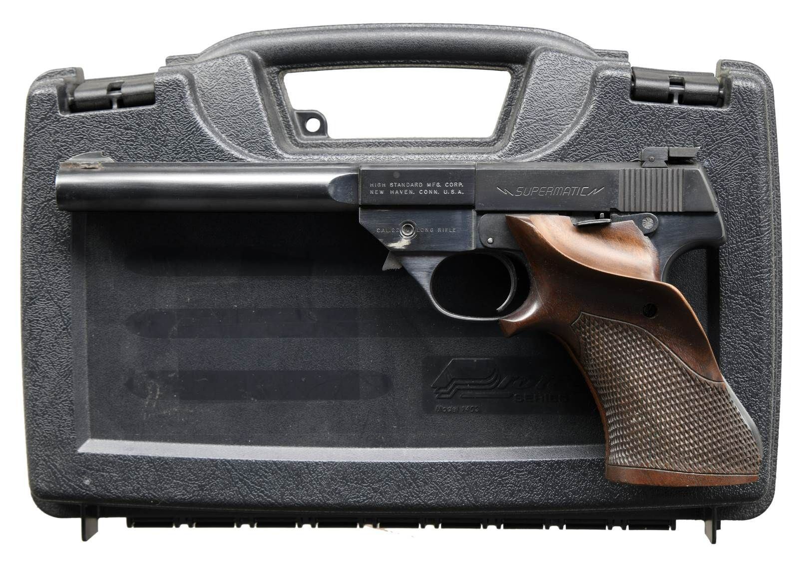 Cal. 22 LR. S# 394729. Bbl. 6 5/8". Supermatic semi-automatic pistol mfg. by High Standard. Left side of bbl. exhibits High Standard's mfg. information, with "SUPERMATIC" on the slide" and the cal. designation on the frame. S# is marked on the right side of the slide. Blued finish, with 2 piece checkered wood thumbrest grips. MAGS: 2-10rd. UNATTACHED ACCESSORIES: generic hard case containing spare mag. CONDITION: very good overall, with metal components retaining the majority of their original factory finish, exhibiting a couple of spots of light wear overall. Mirror bore, exhibiting well defined rifling throughout. Grips show some smoothing and some scattered marks from handling and storage, with the left panel exhibiting a crack to the rear of the trigger. (23-4939/MLW). CURIO. $300-500.