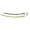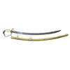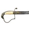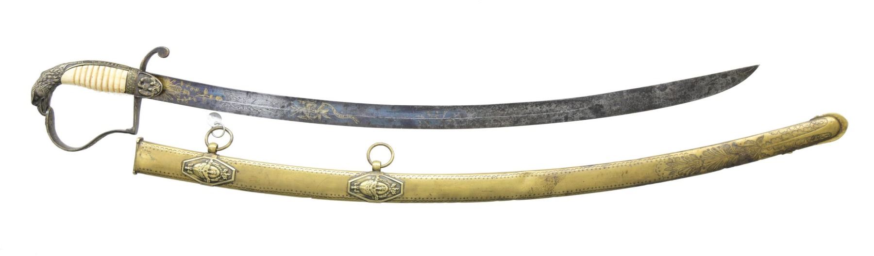 OFFICER’S SABER BY BERGER. Overall length: 38 3/4". Blade length: 29 1/2". Blade has a single large fuller with an exceptional tricolor blade. The blued field extends about 16" up the blade and features a white panel on each side showing sprays of arms. Gilt-highlighted etching includes an eagle atop a federal shield with an "E PLURIBUS UNUM" ribbon in its mouth, allegorical sprays of arms, and a liberty cap on pole. Near the ricasso, under the languet, are the words "Warranted A. BERGER." Gilded brass hilt with an eagle languet on the front. Downturned quillon and classically decorated reverse P knuckle bow. Eagle head pommel with embellishments filling the backstrap. Bone grip with nine horizontal rings. Gilded brass scabbard with the head of Mars on the suspension ring assembly. The tip of the scabbard is heavily embellished with foliate motifs. CONDITION: blade shows a general, dark patina, yet the blued field remains apparent. White panels are a bit dark, but the gold-highlighted etching remains strong. Only traces of original gilding remain on the hilt, and the grip is undamaged. Scabbard also shows traces of original gilding, with a few very minor dents to the body and numerous blade strikes to the edge of the scabbard, likely incurred during a children’s game. (02-23029/BF). $1,200-1,500.