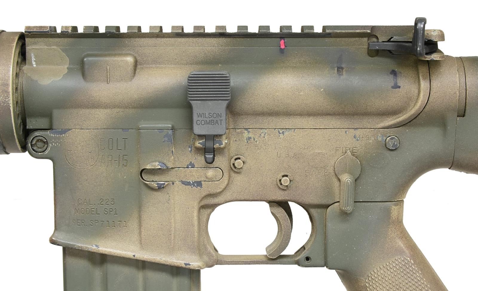Cal. 223. S# SP71171. Bbl. 20". An early SP1 Colt in what appears to be an extremely purpose built configuration. Many of the accessories & upgrades have actually become standard on later guns, so this one may have been well ahead of its time. The front sight post above the gas block has been trimmed down to be almost even w/ an aluminum free floating hand guard. Still retaining the A2 flash hider. Sling swivel added to handguard at 7 o’clock position coinciding w/ 6 o’clock sling mt. on shoulder stock, currently wearing brown painted black canvas sling. Flat top upper receiver w/ brass deflector & rnd. forward assist. Highly extended mag. release & Wilson Combat extended bolt release. Anti walk pins through trigger group & a wide aftermarket shoe added to trigger. Aftermarket charging handle release. Full length A2 buttstock w/ a composite riser screwed into place. Entire package covered in a unique brown & green camouflage pattern. MAGS: 1-20 rd. metal. in matching camouflage pattern. CONDITION: the heavy camouflage pattern covers the entirety of exposed surfaces, so it is hard to determine condition of originality. Receivers are tight due to the addition of an AccuWedge. Trigger feels light & crisp. Lower receiver has been gently modified to accept the extended mag. release & adj. for over travel. Bore is shiny w/ decent rifling. Fire control mechanism appears to function correctly when cycled by hand. (21-759/JZ). MODERN. $600-1,000.
