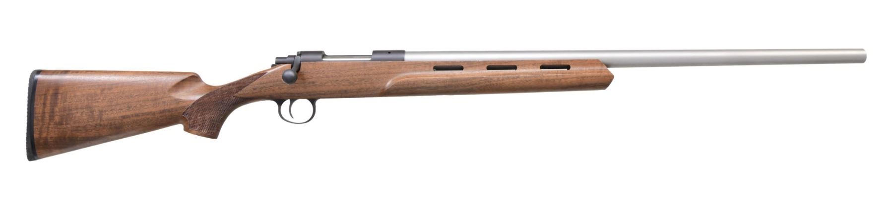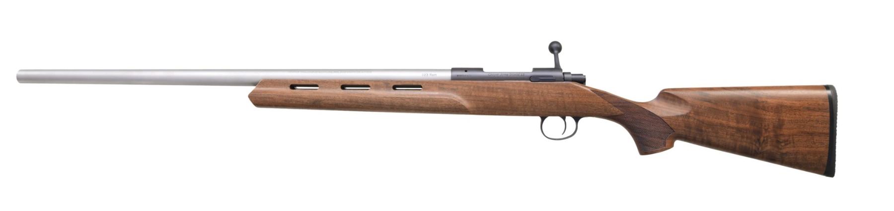 BOLT ACTION RIFLE WITH MATCHING BOX. Cal. 223 Rem. S# SCHEELS273. Bbl. 24". Model 21 single shot bolt action rifle mfg. by Cooper Arms. The left side of the bbl. is marked "COOPER FIREARMS OF MONTANA, INC., STEVENSVILLE, MT USA", with the cal. designation marked towards the breech. Left side of receiver is marked with the S# "SCHEELS273", followed by "Cooper Arms Model 21". Receiver and bolt handle exhibit a matte blue finish, with the heavy bbl. exhibiting a matte stainless steel finish. Aluminum trigger guard exhibits a matte black finish. Bolt body is polished in-the-white. 1-piece checkered wood pistol grip buttstock, with ventilated beavertail forearm. Receiver is factory drilled and tapped. Bolt matches the receiver via an electro-penciled "SC/ 273" on the underside of the bolt root. UNATTACHED ACCESSORIES: matching box containing a styrofoam insert. CONDITION: near new, with metal components retaining virtually all of their original factory finishes overall. Brilliant mirror bore, exhibiting well defined rifling throughout. Stock is excellent overall. Box exhibits some exterior wear from handling and storage, but otherwise remains sturdy and serviceable. Styrofoam insert has broken at one corner, with the broken section remaining present. An extremely attractive Cooper Arms Model 21 single shot bolt action rifle. (24-3277/MLW). MODERN. $1,750-2,500.