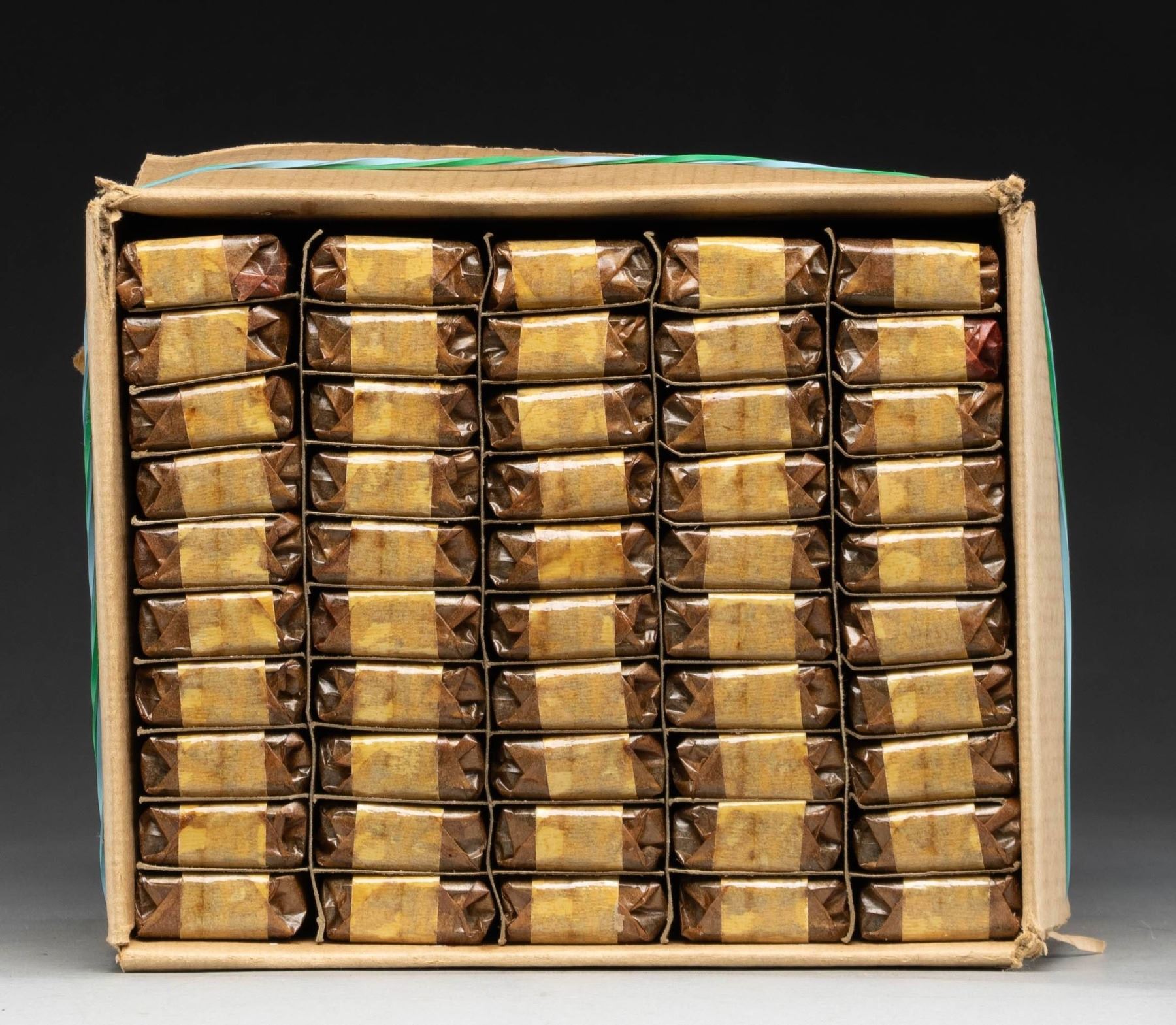 POSTAL METER M1 CARBINE MAGAZINES. Arsenal box of M1 Carbine 15-rd. mags. Front of box is marked with an ordnance escutcheon above a boxed "MAGAZINE, ASSEMBLY/ GUN, U.S. CARBINE CAL. .30M1/ ORD. DWG. & PC. MK. - B - 212603/ SNL NUMBER - B - 28/ CODE INDEX NUMBER - 01 - 00260/ QUANTITY - 100/ NATIONAL POSTAL METER COMPANY, INC.". Rear of box exhibits a handwritten "30 CAL./ CARBINE/ MAG'S" in marker. All mags. remain present and are wrapped in their arsenal protective wax paper packaging. CONDITION: box is good to very good, exhibiting some wear and scattered marks from handling and storage, while remaining sturdy and serviceable. Mags. are as new from the arsenal. An incredibly rare chance for the M1 Carbine collector to add a complete 100 count box of National Postal Meter M1 Carbine mags. to their collection. (02-25514/MLW). NON-GUN. $1,200-2,000.