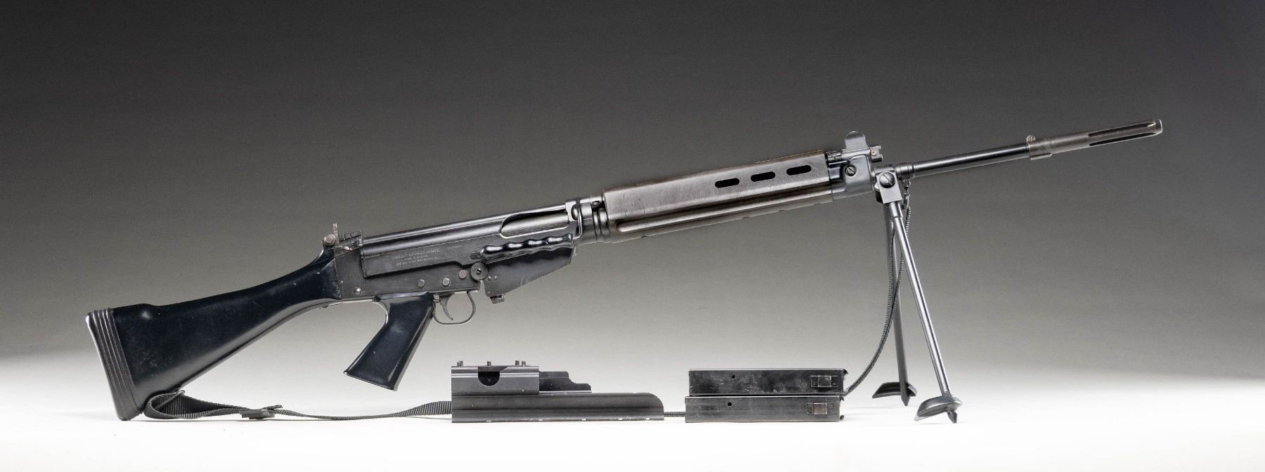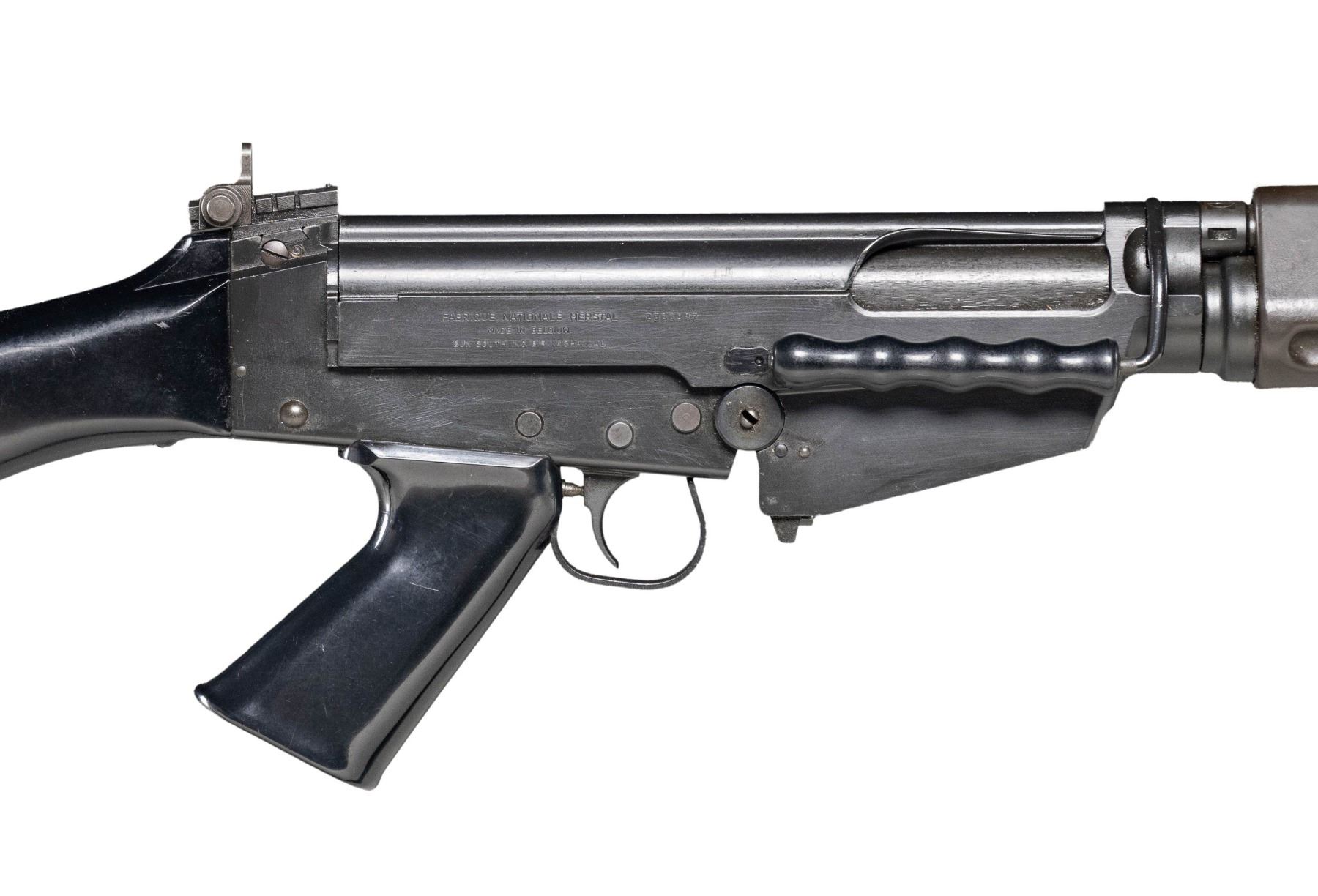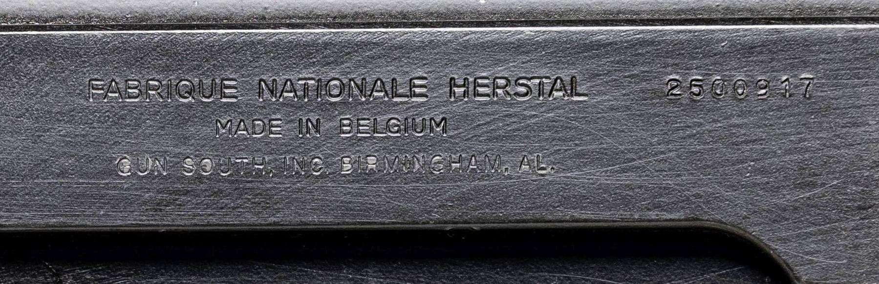 NATIONAL / GUN SOUTH INC. FAL .308 MATCH 50.00 SEMI-AUTOMATIC RIFLE. Cal. 308. S# 2500917. Bbl. 18". One of a limited number of FAL .308 Match 50.00 semi-automatic rifles mfg. in Belgium by Fabrique Nationale that were imported into the United States prior to discontinuation by FN. The left side of the Type III milled receiver is marked ".308 MATCH", with "FABRIQUE NATIONALE HERSTAL/ MADE IN BELGIUM/ GUN SOUTH INC. BIRMINGHAM, AL." followed by the S# "2500917" marked on the right. The selector on the left side of the lower is marked "S" and "R", with no notch cut for a third position. Receiver, lower assembly, front sight / gas tube assembly, forearm hardware, bipod, and bbl. exhibit a black enamel type finish, with the long pattern flash hider and rear sight exhibiting a phosphate finish. 2-piece brown synthetic ventilated handguard, with plain black synthetic charging handle, carry handle, pistol grip, and fixed buttstock. Standard FAL pattern post front sight and sliding aperture rear sight with base graduated 2-6. Belgian proofed bolt and bolt carrier match the receiver via "00917". MAGS: x1 blued steel mag. and x1 black enamel finished steel mag. UNATTACHED ACCESSORIES: matte black finished aluminum optic rail. CONDITION: metal components retain the vast majority of their original factory finishes, exhibiting some superficial handling marks as well as some small spots of light wear overall. Brilliant mirror bore, exhibiting sharp and well defined rifling throughout. Proper manual mechanics. Synthetic furniture shows some superficial marks from handling and storage, but otherwise remains very good overall. A high condition example of a rare and desirable Fabrique Nationale FAL .308 Match 50.00 rifle. (25-5225/MLW). MODERN. $2,500-4,000.
