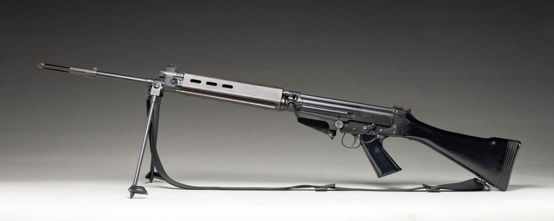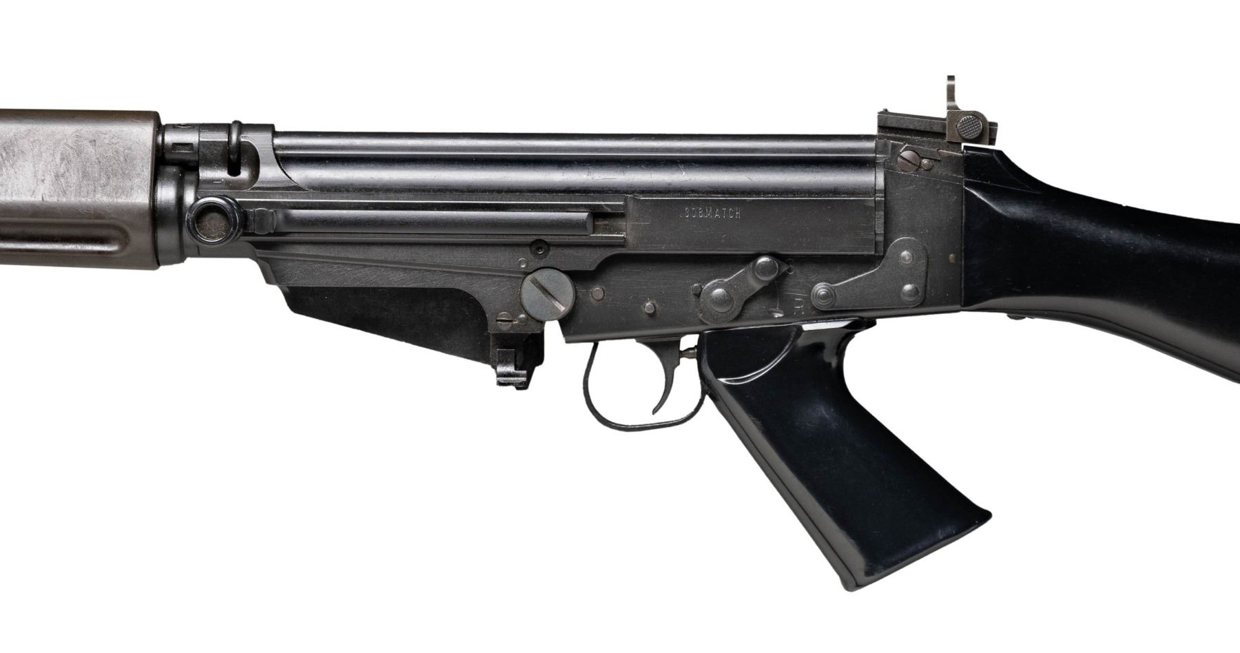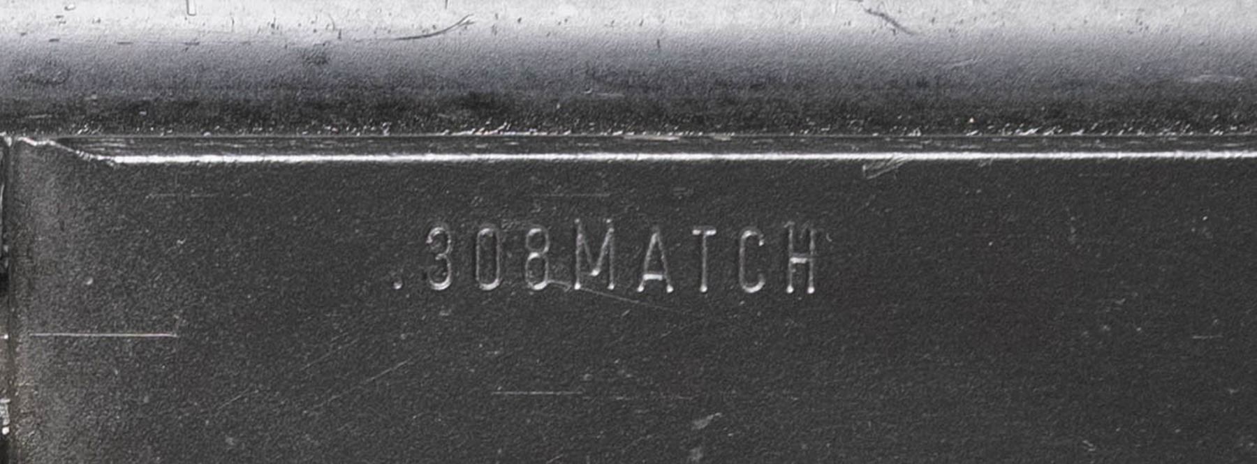 NATIONAL / GUN SOUTH INC. FAL .308 MATCH 50.00 SEMI-AUTOMATIC RIFLE. Cal. 308. S# 2500917. Bbl. 18". One of a limited number of FAL .308 Match 50.00 semi-automatic rifles mfg. in Belgium by Fabrique Nationale that were imported into the United States prior to discontinuation by FN. The left side of the Type III milled receiver is marked ".308 MATCH", with "FABRIQUE NATIONALE HERSTAL/ MADE IN BELGIUM/ GUN SOUTH INC. BIRMINGHAM, AL." followed by the S# "2500917" marked on the right. The selector on the left side of the lower is marked "S" and "R", with no notch cut for a third position. Receiver, lower assembly, front sight / gas tube assembly, forearm hardware, bipod, and bbl. exhibit a black enamel type finish, with the long pattern flash hider and rear sight exhibiting a phosphate finish. 2-piece brown synthetic ventilated handguard, with plain black synthetic charging handle, carry handle, pistol grip, and fixed buttstock. Standard FAL pattern post front sight and sliding aperture rear sight with base graduated 2-6. Belgian proofed bolt and bolt carrier match the receiver via "00917". MAGS: x1 blued steel mag. and x1 black enamel finished steel mag. UNATTACHED ACCESSORIES: matte black finished aluminum optic rail. CONDITION: metal components retain the vast majority of their original factory finishes, exhibiting some superficial handling marks as well as some small spots of light wear overall. Brilliant mirror bore, exhibiting sharp and well defined rifling throughout. Proper manual mechanics. Synthetic furniture shows some superficial marks from handling and storage, but otherwise remains very good overall. A high condition example of a rare and desirable Fabrique Nationale FAL .308 Match 50.00 rifle. (25-5225/MLW). MODERN. $2,500-4,000.