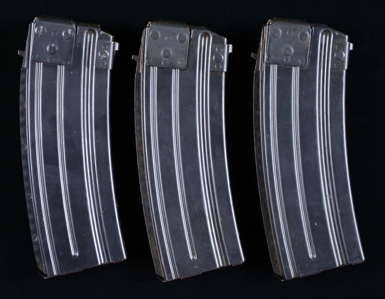30 ROUND MAGAZINES. Lot consists of 3 30-rd. Pre-Ban Finnish Valmet .223 factory mags. Rugged steel construction with distinctive 3-welds at feed lip reinforcements. CONDITION: very good overall, with mags. retaining the vast majority of their original factory blue finish, exhibiting a few small spots of light wear, and some superficial marks from handling and storage overall. (02-21808-1/MLW). $800-1,400.