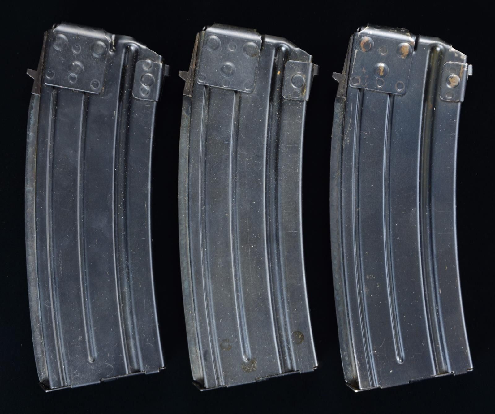 30 ROUND 3-WELD MAGAZINES. Lot consists of three 30-rd. Pre-Ban Finnish Valmet .223 factory mags. Rugged steel construction with distinctive 3-welds at feed lip reinforcements. CONDITION: very good overall, with mags. retaining the vast majority of their original factory blue finish, exhibiting a few small spots of light wear, and some superficial marks from handling and storage overall. One mag. shows some very small scattered spots of light surface oxidation. PROVENANCE: the lifelong collection of Terrence McCarty. (02-21808-14/MLW).$800-1,400.