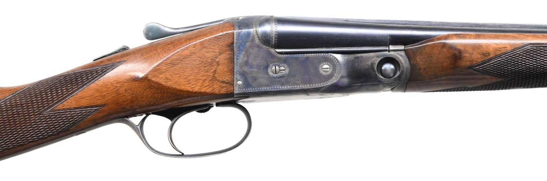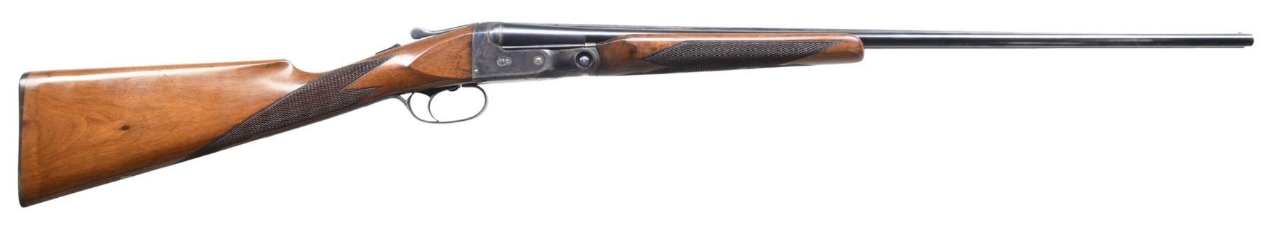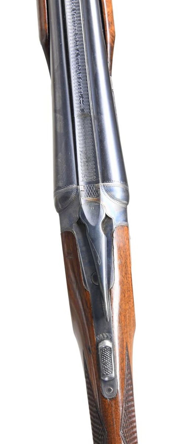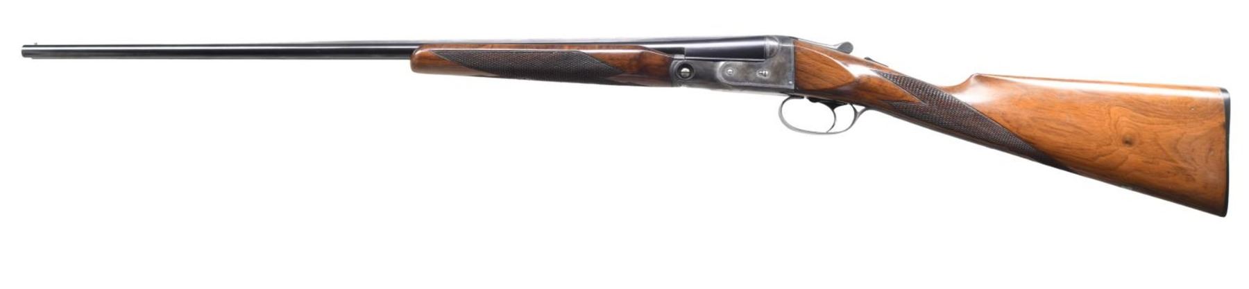 SHOTGUN WITH ORIGINAL TRAP MODIFIED FOREND. Cal. 410, 3" chamber. S# 236229. According to page 258 of "The Parker Story" only 463 VH grade Parkers were manufactured in 410 with 26" Vulcan steel bbls. A mere 163 VH grade Parker shotguns in any gauge were produced with the trap modified forearm. Additionally, found on the same page, single triggers appear on a scant 3% of the entire V Grade production, making this an exceptionally rare Parker. Bbls. 26" of Vulcan steel w/ fixed full & full chokes. Front bead. Case colored 000 frame boxlock action. Features include a Parker single selective trigger & automatic ejectors. Action has borderline engraving. Original trap style beavertail forearm & straight grip walnut stock w/ hand checkering. DAH: 1 15/16". DAC: 1 3/8". LOP: shortened to 14" over reattached dog's head hard rubber buttplate. Stock has neutral cast. WEIGHT: 5 lbs, 13 oz. UNATTACHED ACCESSORIES: photo-copy of a letter from the Parker Gun Collector's Association, Inc. detailing the following information "Parker shotgun, serial number 236229, was manufactured in 1933. According to Parker Bros. Stock Book No. 82, it was a VHE hammerless .410 on a size 000 frame and a single trigger. It featured Vulcan steel barrels with a length of 26 inches and 2 15/16" chambers. Its stock configuration was a straight grip with a trap modified for-end. According to Parker Bros Stock Book No. 82, its specifications were: Length of Pull: 14 1/2", Drop at Heel: 2", Drop at Comb: 1 3/8", Weight: 5 pounds. 13 ounces. The price listed in the 1933 price list for a VHE grade with single trigger was S126.50 plus $14.85 for a trap modified for-end". CONDITION: bbls. have 95% original blue. Action has over 90% original case colors w/ slight fading in carry areas. Trigger guard has fading blue w/ touch up on tang. Stock finish is touched up around reattached buttplate & shows scattered scratches & marks. Very good bright bores. Sound mechanical operation. (24-934). CURIO. $40,000-60,000.