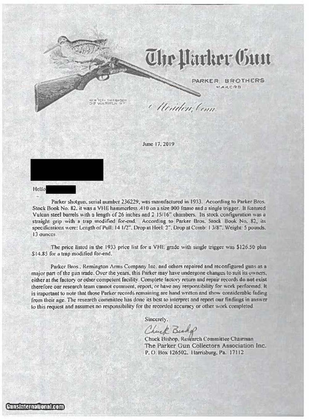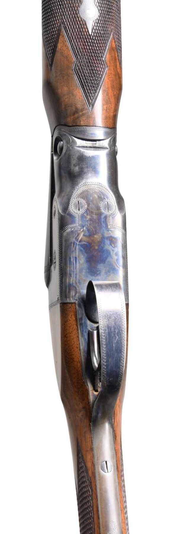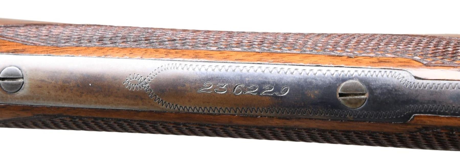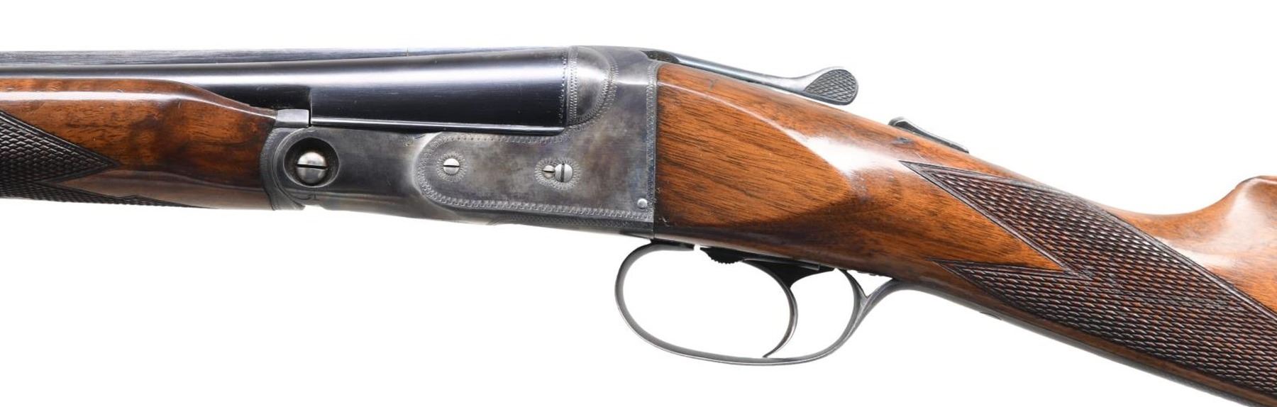 SHOTGUN WITH ORIGINAL TRAP MODIFIED FOREND. Cal. 410, 3" chamber. S# 236229. According to page 258 of "The Parker Story" only 463 VH grade Parkers were manufactured in 410 with 26" Vulcan steel bbls. A mere 163 VH grade Parker shotguns in any gauge were produced with the trap modified forearm. Additionally, found on the same page, single triggers appear on a scant 3% of the entire V Grade production, making this an exceptionally rare Parker. Bbls. 26" of Vulcan steel w/ fixed full & full chokes. Front bead. Case colored 000 frame boxlock action. Features include a Parker single selective trigger & automatic ejectors. Action has borderline engraving. Original trap style beavertail forearm & straight grip walnut stock w/ hand checkering. DAH: 1 15/16". DAC: 1 3/8". LOP: shortened to 14" over reattached dog's head hard rubber buttplate. Stock has neutral cast. WEIGHT: 5 lbs, 13 oz. UNATTACHED ACCESSORIES: photo-copy of a letter from the Parker Gun Collector's Association, Inc. detailing the following information "Parker shotgun, serial number 236229, was manufactured in 1933. According to Parker Bros. Stock Book No. 82, it was a VHE hammerless .410 on a size 000 frame and a single trigger. It featured Vulcan steel barrels with a length of 26 inches and 2 15/16" chambers. Its stock configuration was a straight grip with a trap modified for-end. According to Parker Bros Stock Book No. 82, its specifications were: Length of Pull: 14 1/2", Drop at Heel: 2", Drop at Comb: 1 3/8", Weight: 5 pounds. 13 ounces. The price listed in the 1933 price list for a VHE grade with single trigger was S126.50 plus $14.85 for a trap modified for-end". CONDITION: bbls. have 95% original blue. Action has over 90% original case colors w/ slight fading in carry areas. Trigger guard has fading blue w/ touch up on tang. Stock finish is touched up around reattached buttplate & shows scattered scratches & marks. Very good bright bores. Sound mechanical operation. (24-934). CURIO. $40,000-60,000.