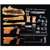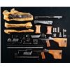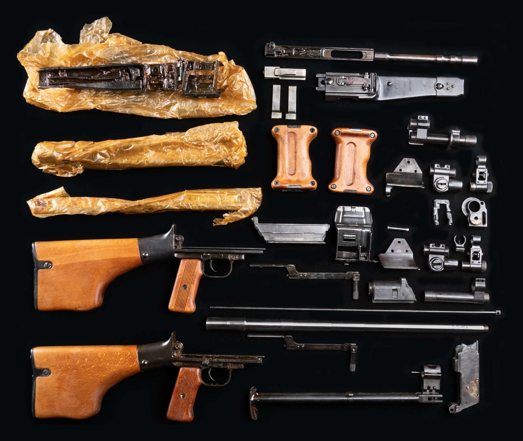Polish RPD parts kit mfg. in Poland at the Radom arsenal. Parts kit consists of: 1) x2 receiver cover assemblies marked with Radom's "11" within an oval insignia (x1 dated "1960", x1 dated "1961) complete with feed trays. 2) x2 bolt carriers with complete bolt assemblies. 3) x2 lower trigger/stock assemblies. 4) x2 sets of 2-piece handguards. 5) x2 bipods. 6) x2 bags of assorted bbl. and gas cyl. tube parts. 7) x1 unfinished stainless steel aftermarket bbl. 8) x1 cleaning rod. 9) x4 torch cut sections of receiver. CONDITION: metal components retain the vast majority of their arsenal blue finish, exhibiting some superficial handling marks, with many retaining a layer of apparent arsenal grease. Wood furniture shows some scattered handling marks and impressions, but otherwise remains sound. An attractive and desirable assortment of Polish RPD parts and components. (02-24591/MLW). NON-GUN. $1,000-1,500.