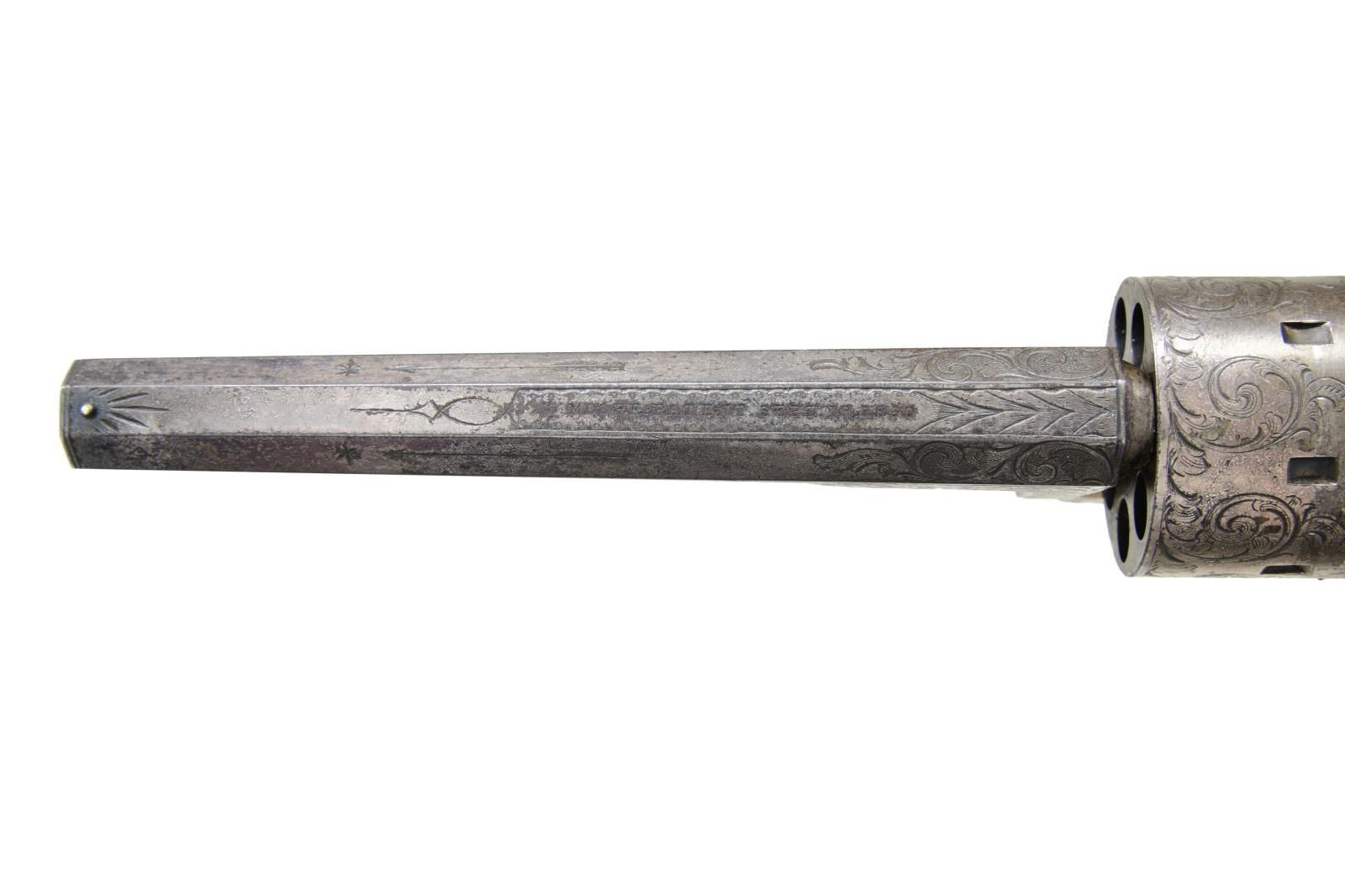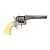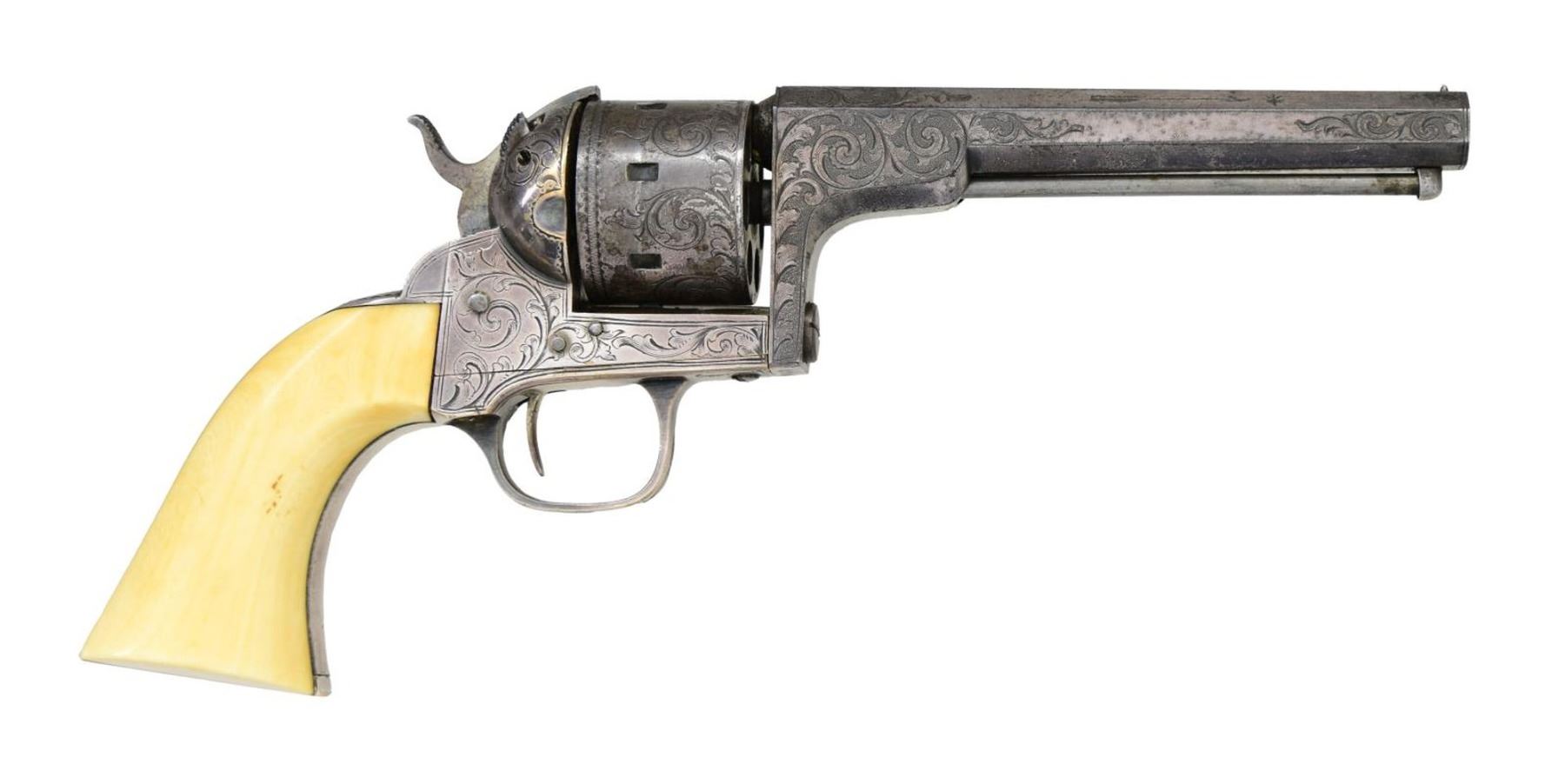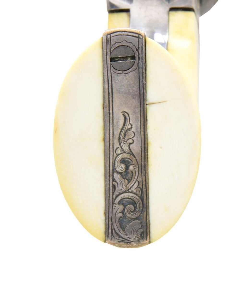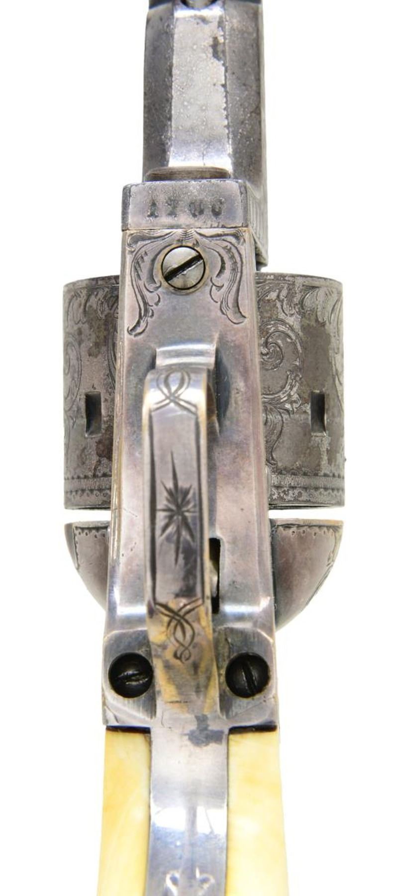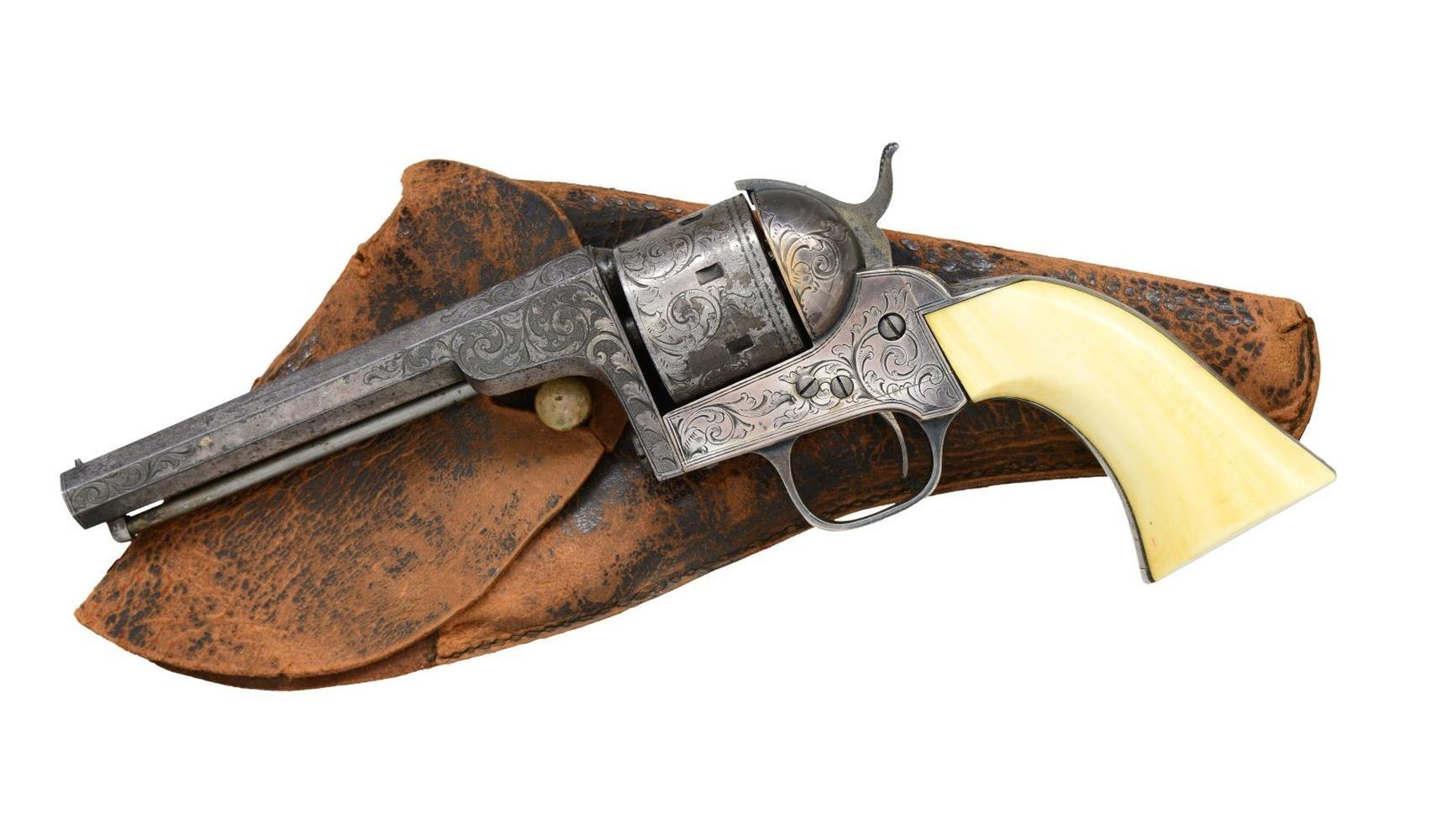 REVOLVER ATTRIBUTED TO DANIEL MOORE, FROM THE MOORE FAMILY, WITH PROVENANCE. Cal. 32 RF. S# 1206. Bbl. 5". Moore's Patent revolver mfg. by Moore's Patent Firearms Company, attributed to being the personal revolver of Daniel Moore. The top flat of the octagonal bbl. is marked "D. MOORE. PATENT. SEPT. 18. 1860". Frame exhibits bordered scroll engraving, with scroll engraving on the sides of the bbl. featuring a punch dot background. Left and right quarter flats of the bbl. are engraved with a small starburst, followed by a feathered arrow. Cyl. also features scroll engraving, with a band of zig-zag line engraving at the rear. Metal components exhibit a silver plated finish overall, with the frame being mounted with a 1-piece smooth ivory grip. UNATTACHED ACCESSORIES: brown leather holster, as well as a binder of paperwork, with notable documents including a letter from Linda P. Esser Villani whom states that Daniel Slocum Moore was her father's great grandfather, documents provided by Linda that include the Internment List and diagram of the graves for the Moore family's plot in Green Wood Cemetery, Brooklyn, NY, as well as a copy of the listing from when this firearm was first publicly offered at RIA in 2009. CONDITION: metal components retain the majority of their original silver plated finish, exhibiting some areas of mild wear that shows through to brass, scattered areas of light flaking, with small scattered spots of flaking overall. Cyl. exhibits flaking overall that shows through to a mottled gray patina. Bore is bright, exhibiting scattered areas of dark oxidation, while retaining strong rifling throughout. Ivory grip exhibits a pleasing age related yellow patina, with some scattered marks from handling and storage. Holster remains malleable, exhibiting age related cracking and crazing, with several tears and small holes present overall. A very nice and attractive example of a Moore's Patent revolver, attributed to being the personal revolver of its inventor, Daniel Moore. (01-25293/MLW). ANTIQUE. $3,000-5,000.
