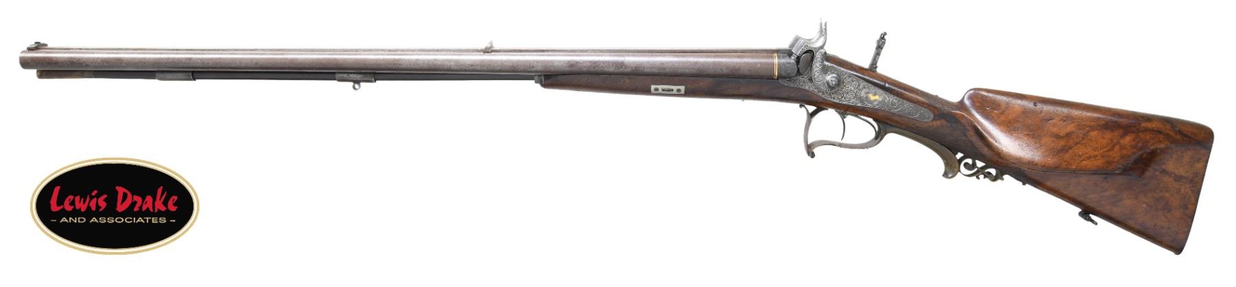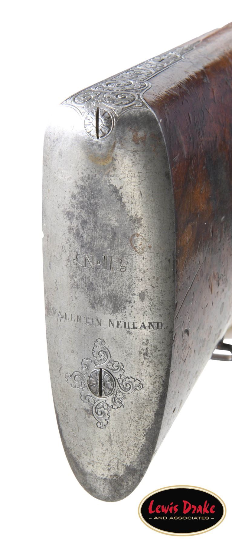 J.L. DOTTER, MADE FOR VALENTIN NEULAND OF WURZBERG. Cal. 54 (right barrel w/twist 8 groove rifling, left with straight rifling). S# NSN. Johann Leonhardt Dotter is known to have been working in Wurzburg, Bavaira around 1844. This finely made rifle is gold inlaid with his name and address on top rib of 27" Bernard damascus barrels. Gold bands and scrolls are also found at breech ends. Rib is fitted with one standing leaf rear and gold bead front sights dovetailed through. Breeches are not vented. Breech iron is very finely scroll engraved and fitted with folding aperture rear sight; adjustable for windage and elevation. Peninsula back spring locks with uniquely filed hammers are near fully engraved with more large shaded scroll matching that found on breech iron. This scroll is unusual in that the shaded infill of the whorls appears to be that of lettuce leaves, or perhaps lichen. This interesting scroll surrounds game scenes with gold inlaid subjects. A doe jumps over fence on left lock and a buck is standing in meadow on right. Trigger plate has long spear finial with matching open scroll engraving. Front trigger is set. Trigger guard with flat front and scroll to bow has carved horn grip extension. A gold inlaid dove is on bow. Buttplate is engraved "No. II" above the name "VALENTIN NEULAND" His obituary states he was born in Wurzburg 26 August 1795 and died 13 February 1873. He was a "privatier". (Man of independent means). More foliate scroll is on long top tang. Stock of well figured European walnut has right hand Bavarian cheekpiece and is checkered at grip. Stock attaches to barrels with captive side bolt through rectangular German silver escutcheons. An ebony ramrod with horn tip and steel tail with worm mounts through two plain pipes and scroll engraved thimble. UNATTACHED ACCESSORIES: photocopy of Valentin Neuland's obituary. CONDITION: good. Barrel retaining some original finish where protected; pattern difficult to see. Locks and other metal parts show light cleaning to overall silver gray. Engraving remains sharp and clear. Stock retains most of its original oil finish with many marks and has some added oil. Bores are very good to fine with strong rifling throughout. Right barrel showing scattered pitting. Locks are crisp. Trigger will not set (needs adjustment). PROVENANCE: from the renowned collection of quality sporting arms from Lewis Drake together with inventory of Lewis Drake Associates. (01-26113/MGM). ANTIQUE. $2,000-3,000.