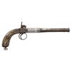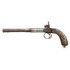 BOXLOCK PERCUSSION PISTOL. Cal. 48 Smoothbore. NSN. Bbl. 8 1/2". Boxlock percussion pistol of unusual design, likely of Eastern European / Mediterranean origin. The bbl. features raised silver colored ornamentation along the top, which is also present around the circumference of the faceted breech section. Additionally, the bbl. features 2 bands at the end of the breech, with 3 bands approx. 7/8" from the cannon flared style muzzle. 1-piece wrap around wood grip features ornate wire inlays that terminate in apparent gold or brass foliate patterns. Rnd. grooved pommel cap with lanyard stud and ring. Bbl. appears to have been turned on a lathe, and is not inline with the breech area on the interior, with the breech extending into bore approx. 1/8" at its widest point in the upper left quadrant. Action is relatively crude comparatively, featuring 2 hammered pins for the unadorned hammer and trigger mechanisms. CONDITION: metal components have faded to a dark gray patina, exhibiting patches of mild pitting predominately on the action. Raised ornamentation appears to have been cleaned at one time, exhibiting a bright appearance. Action functions appropriately when cycled by hand. Grip shows some superficial marks from handling and storage, with wire inlays remaining intact. An extremely unusual Eastern European / Mediterranean boxlock percussion pistol. (01-28220/MLW). ANTIQUE. $500-800.