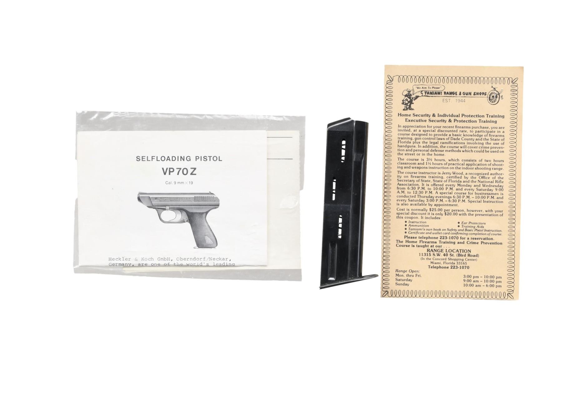 Cal. 9x19 S# 73164 (HK = 1979). This model features a matte black finish. Barrel length is 4.6 inches. Equipped with standard fixed front and rear sights. The polymer frame includes a magazine release button on the heel of the grip. MAGS: 2-18 Rds. UNATTACHED ACCESSORIES: Factory box, manual, additional documentation. CONDITION: Overall condition is near excellent. Slide retains about 95% of its original matte black finish with light scratches. Frame shows approximately 95% finish coverage. Bore is bright with strong rifling. PROVENANCE: Lifelong Collection of Terrence McCarty. MODERN (24-200/MD) $700-$1,000.