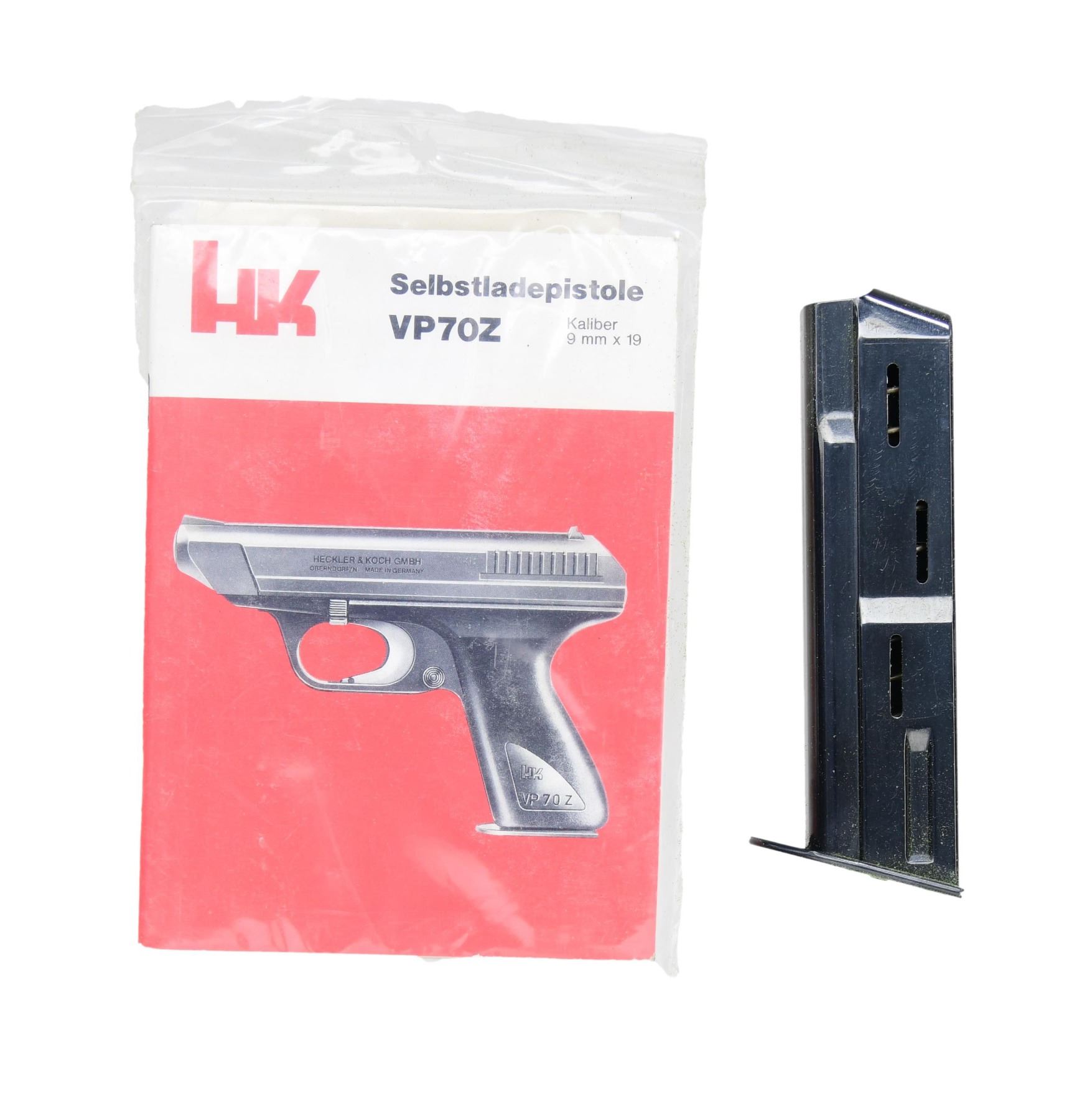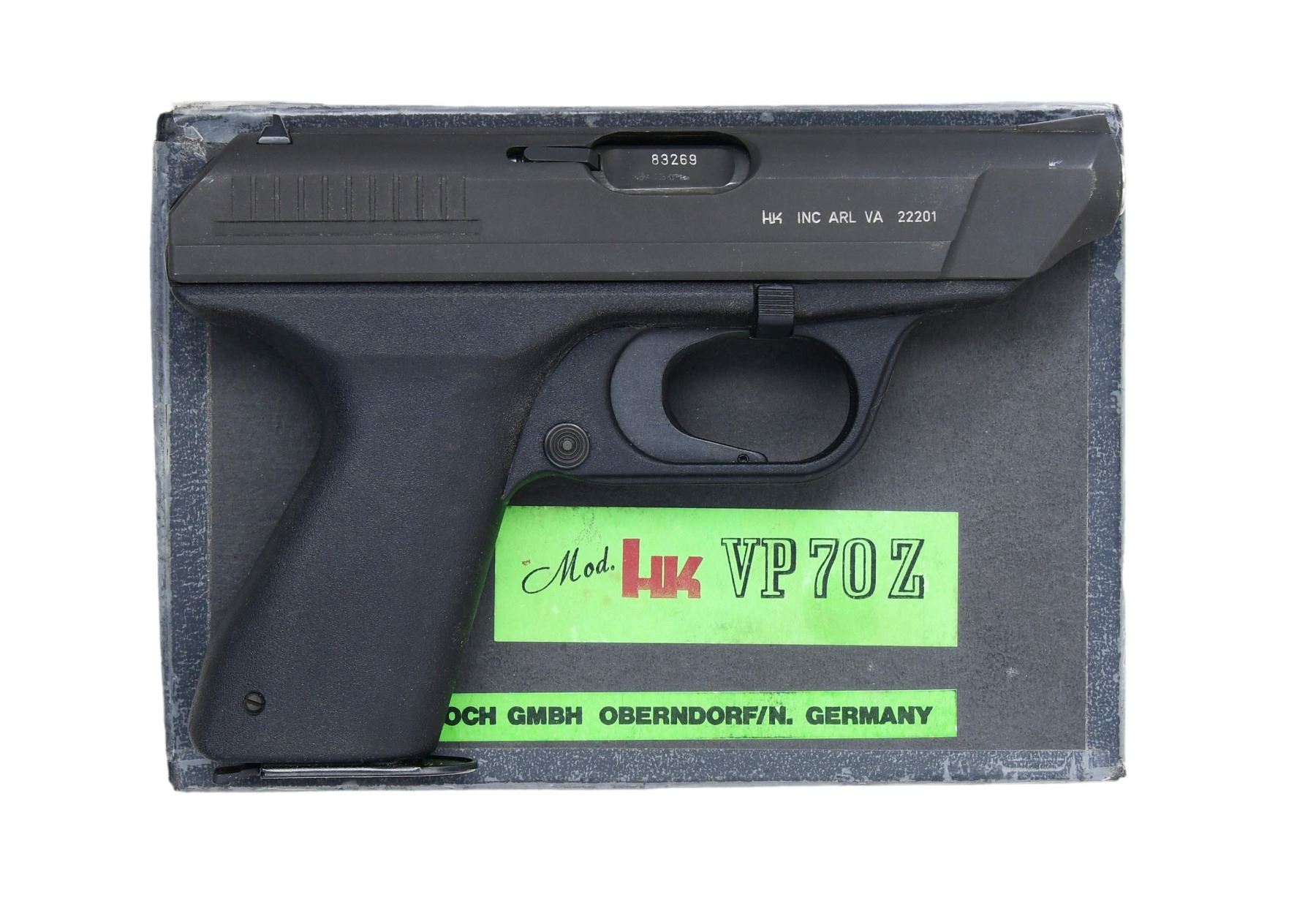 Cal. 9x19. S# 83269. This Heckler & Koch VP70Z features a matte black finish. The barrel length is 4.6 inches. The front sight is a fixed blade, and the rear sight is a fixed notch. The frame configuration includes a polymer frame with an integrated trigger guard. The grips are part of the polymer frame design. MAGS: 2-18 Rds. UNATTACHED ACCESSORIES: Original factory box and manual. CONDITION: Overall condition is near excellent with approximately 95% of the original finish remaining on the slide and frame; top portions of front sight have been milled to bright. The bore is bright and sharp. PROVENANCE: Lifelong Collection of Terrence McCarty. MODERN (24-261/MD) $600-$900.