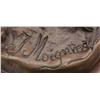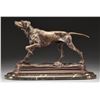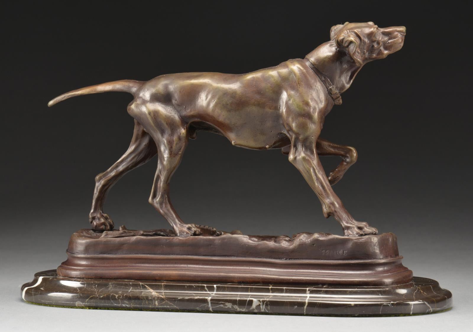 Bronze sculpture of a pointing dog w/ woodland foliage covered base. The sculpture is mounted on a 13 1/2"x6" marble base w/ beveled edge. Statue height is 8 1/2". Weight: 19 lbs. Jules Moigniez (1832-1894) was a well regarded French animalier. Most of his work was sold in England or Scotland. US Importation began in 1869. CONDITION: bronze sculpture retains very good, original patina. (02-16529/DS). $1,000-2,000.