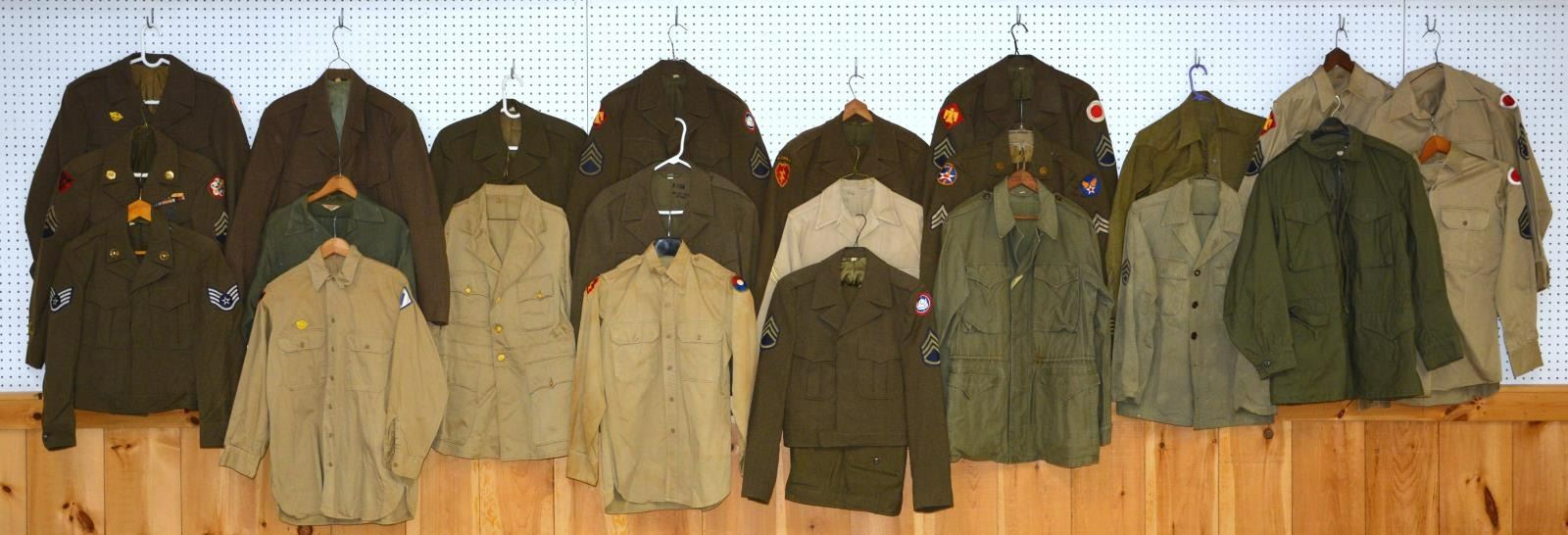 UNIFORMS. 1 Pair of fur-lined OD cold weather pants with suspenders. / 1 OD field jacket 8405-255-8590 with cold weather hood in the pocket. / 2 OD overseas caps. / 1 Khaki long sleeve shirt for a 1st Staff Sergeant with an 8th Air Force patch on the left shoulder. / 1 Long sleeve khaki shirt with a 43rd Infantry patch on the right shoulder. / 1 Long sleeve khaki shirt with a 25th Infantry Division patch on the right shoulder. / 1 Khaki tie. / 1 US Army dress uniform with pants for a Staff Sergeant with a 1st Army patch on the left shoulder. / 1 US Army dress uniform with pants, with no insignia. / 2 Long sleeve khaki shirts with no insignia. / 1 Long sleeve khaki shirt with a 43rd Infantry patch on the right shoulder and a ruptured duck above the pocket. / 1 WWI Ike jacket & pants for a Staff Sergeant with a 47th Infantry Division patch on the left shoulder. / 1 Blue Medical Corps Orderly shirt with “US” & caduceus on the pocket. / 1 WWII OD winter shirt in unissued condition. / 1 Size 38L M1943 field jacket. / 1 OD US Army trench coat with belt. / 1 US Air Force OD type L1 flight suit. / 1 Herringbone weave fatigue shirt with 13-star buttons. / 1 OD fatigue jacket, size 36, possibly M1943. / 1 Large mosquito net. / 3 Long sleeve khaki shirts for a Staff Sergeant, with a 45th Infantry Division patch at the right shoulder, and a 37th Infantry Brigade patch on the left shoulder. / 1 Air Force Ike jacket with collar insignia & stripes for a Staff Sergeant. / 2 Khaki belts with friction buckle. / 1 Khaki tie. / 1 Ike jacket with Corporal stripes & a US Army Communication Zone Europe patch. / 1 Ike jacket for a Staff Sergeant with a 45th Infantry Division patch on the right shoulder, & a 37th Infantry Brigade patch on the left shoulder. / 1 Ike jacket with pants, having a 25th Infantry Division patch & Korea patch on the right shoulder, and a 9th Infantry Division patch on the left shoulder. / 1 Long sleeve OD winter weight WWII field shirt. / 1 WWII Ike jacket for a Sergeant with a 7th Air Force patch at the right shoulder, & an Air Force patch at the left shoulder. Uniform also has correct collar discs, ribbon bar, & ruptured duck. / 2 Herringbone fatigue shirts for a 1st Sergeant with plastic OD buttons. / 1 Fatigue shirt & pants for the Maine State Guard, with a 98th Infantry Division patch on the right shoulder, and a Maine State Guard patch on the left shoulder. / 2 Pairs of herringbone weave fatigue pants with 13-star buttons. / 1 US Army OD sweater with 5-button top. / 1 Long sleeve khaki shirt & pants for a Sergeant, with an Air Corps patch on the left shoulder. / 3 Ike jackets with no insignia. / 1 Pair of WWII OD wool pants. / 1 Khaki uniform tunic for the Coast Guard. / 1 WWII Ike jacket for a Technical Sergeant, with an 86th Division patch at the right shoulder, & a Ground Forces Western Pacific Star at the left shoulder. Uniform is complete with collar discs, ribbon bars, & Sterling Rifle Qualification Badge. / 1 WWII Ike jacket with a 25th Infantry Division patch at the left shoulder, & a ruptured duck above the pocket. / 1 WWII Ike jacket & pants for a Staff Sergeant. Uniform has a 45th Infantry Division patch at the right shoulder, & a 47th Infantry Division patch at the left shoulder. CONDITION: most uniforms show very light to light wear and have been well cared for. A superb lot for the uniform collector. (02-20942/BF). $1,200-1,800.