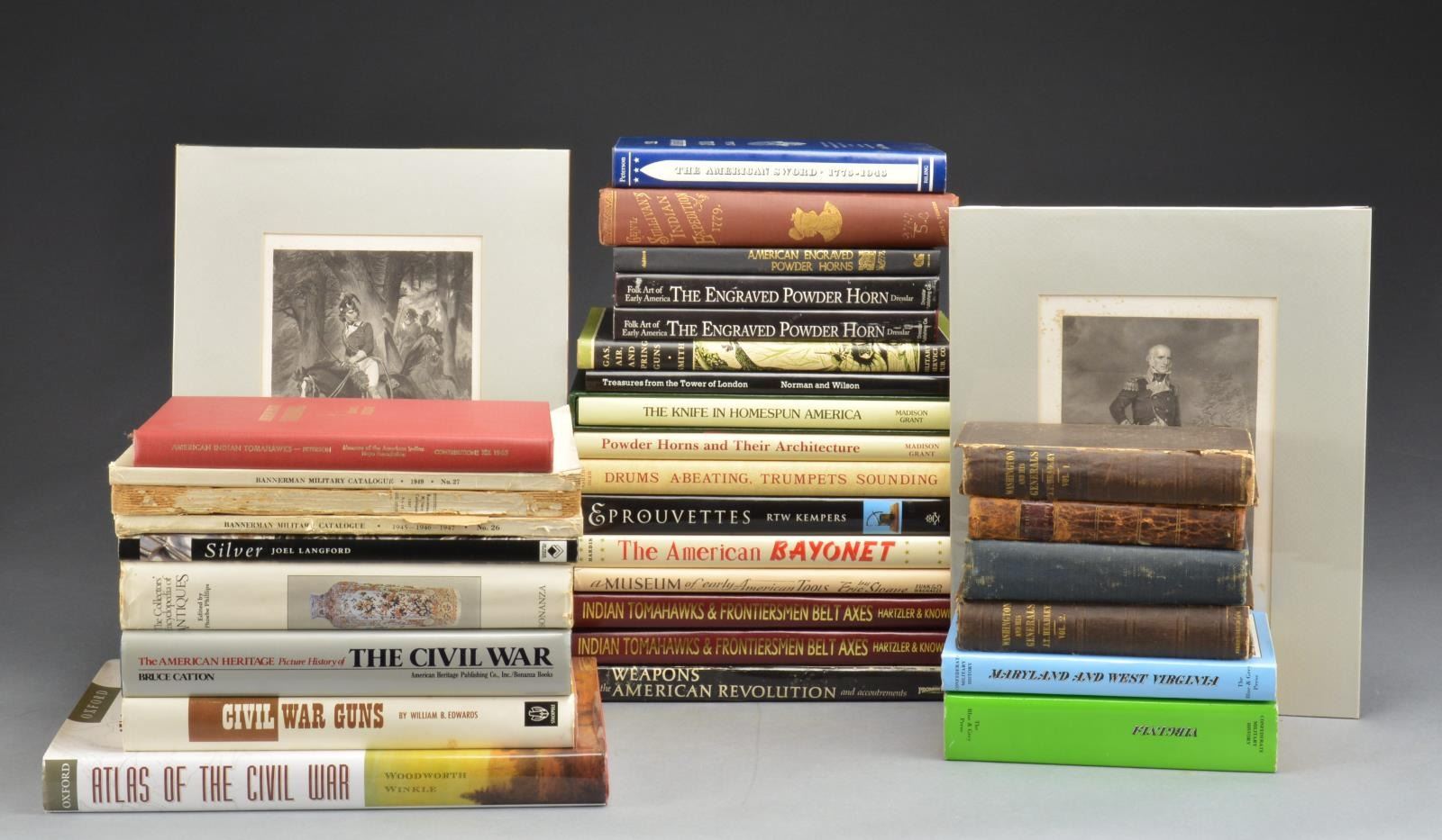 ACCOUTREMENT BOOKS & PUBLICATIONS. Well over 100 books & publications on the early hunting rifles of various states & Kentucky rifles in general. There are books on American silver, the Civil War, powderhorns & various other subjects. Highlights include “Gunsmiths of Ohio” by Hutslar, “Thoughts on the Kentucky Rifle” by Kindig, “The Kentucky Rifle” by Dillin, “Kentucky Rifle Patchboxes and Barrel Marks” by Chandler, “Old Silver” by Wyler, “The Knife in Homespun America” by Grant, “American Engraved Powder Horns” by Dumont”, “The Engraved Powderhorn” by Dresslar, “Drums A’beating, Trumpets Sounding” by Guthman, “The American Bayonet” by Hardin, “Indian Tomahawks and Frontiersmen Belt Axes” by Hartzler & Knowles & many, many more. CONDITION: all books are used but in serviceable condition. PROVENANCE: From the Collection of John "Tim" Breth Jr. (02-13943-2/BF). $500-800.