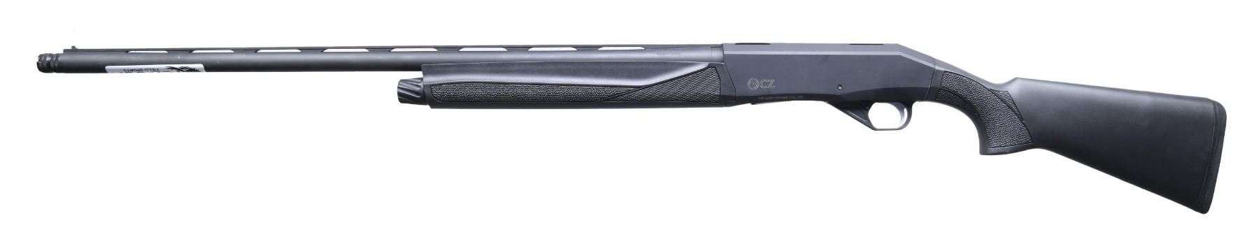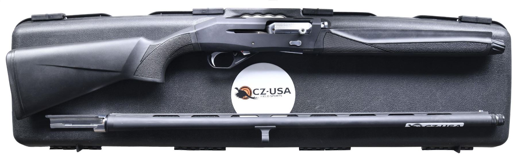 WITH IMPORTER HARD CASE. Cal. 12 GA, 3". S# 20R8877. Bbl. 28 1/2". Model 1012 semi-automatic shotgun mfg. in Turkey by Huglu and imported/retailed by CZ-USA. Left side of the bbl. is marked "HUGLU", followed by the cal. designation, above "Made In Turkey". Left side of the receiver is marked with the CZ logo above CZ-USA's importer information, with the S# marked on the right, and the model designation marked on the underside. Aluminum receiver, trigger guard, and steel bbl. exhibit a matte black finish overall. Textured and checkered black polymer pistol grip buttstock and forend. Matte V/R, with white plastic bead front sight and threaded Improved Modified choke. Matching S#s are present on the receiver and bbl. UNATTACHED ACCESSORIES: CZ-USA black plastic hard case, containing a Full and Cylinder choke. CONDITION: very good, with metal components retaining the majority of their original factory finishes, exhibiting some light to mild wear on the edges of the bbl. below the forend line. Mirror bore. Black polymer furniture is excellent overall. (24-7083/MLW). MODERN. $300-500.