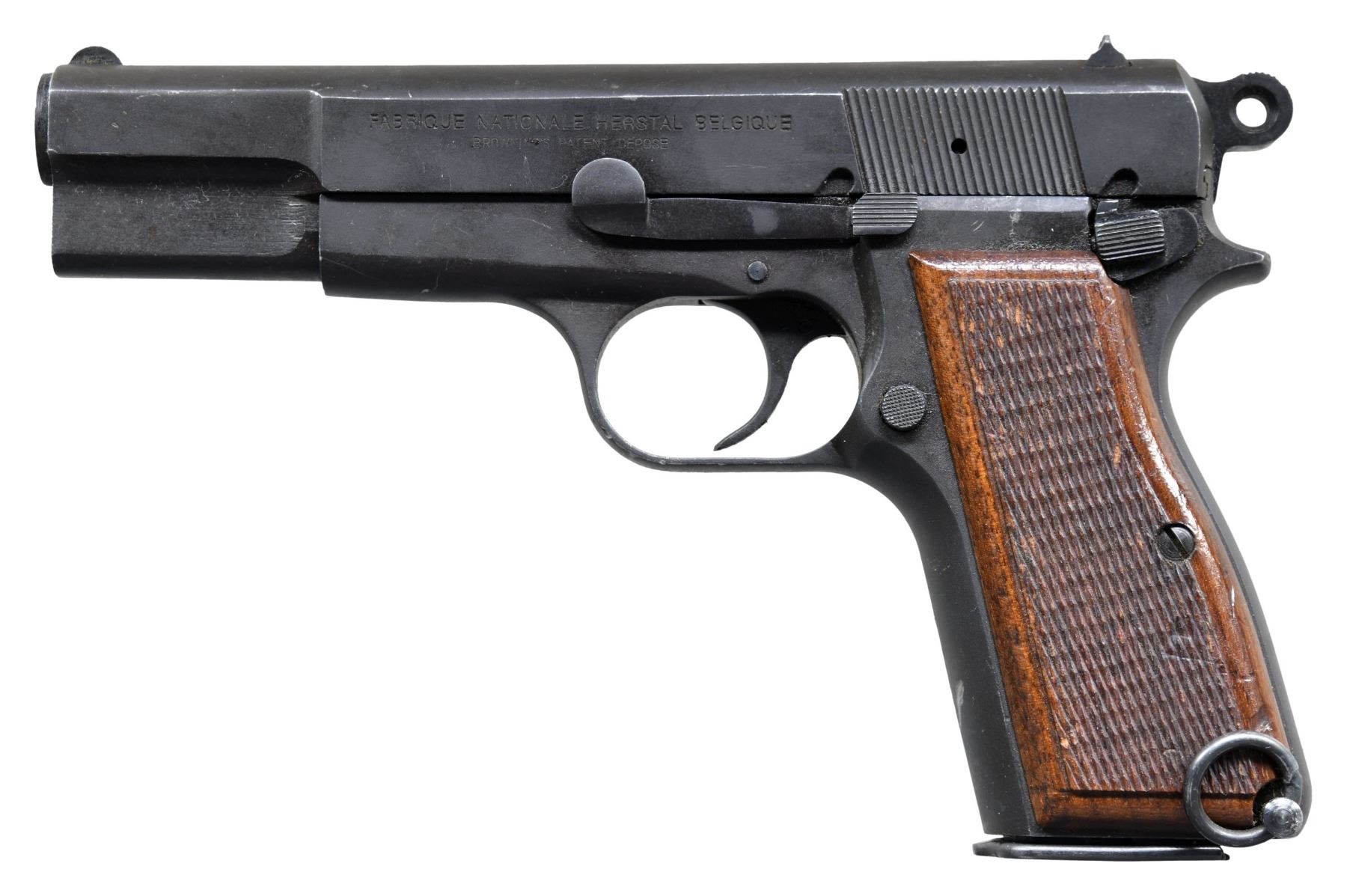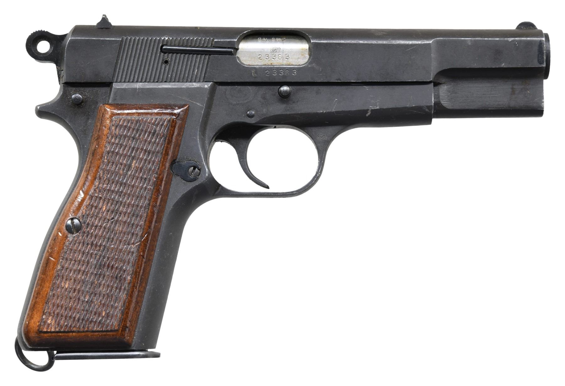 PISTOL. Cal. 9mm Luger. S# L23363. Bbl. 4 5/8". Copy of an FN High Power semi-automatic pistol mfg. in Hungary. The left side of the slide is marked with an erroneous "FABRIQJE NATIONALE HERSTAL BELGIQUE/ BROWNING'S PATENT DEPOSE". Underside of the trigger guard exhibits a Century Arms' import mark. Right side of the forward trigger guard and bbl. exhibit spurious Belgian proofs. Metal components exhibit a phosphate finish overall, save for on the 2-piece bbl., which is polished in-the-white. Frame is mounted with 2-piece checkered wood grips, which feature red paint on the interior of the panels, and also features a blued lanyard ring on the left side. Slide features an external extractor, with a fixed half-moon blade front sight, and dovetailed U-notch rear sight. All serialized parts are matching and include the frame (front grip strap), slide, and bbl. (minus "L" prefix). MAGS: 1 blued 13-rd., with blued split tail floorplate, stamped with an upside down "U" proof on the spine. CONDITION: metal components retain the majority of their original factory phosphate finish, exhibiting some light wear and thinning (primarily on edges), with scattered superficial handling marks present overall. Brilliant mirror bore, exhibiting some areas of grease, while retaining well defined rifling throughout. Grips show some smoothing, as well as scattered marks and minor impressions from handling and storage, but otherwise remain sturdy and serviceable. PROVENANCE: The Estate Collection of Charles Wagner. (25-401/MLW). CURIO. $600-1,000.