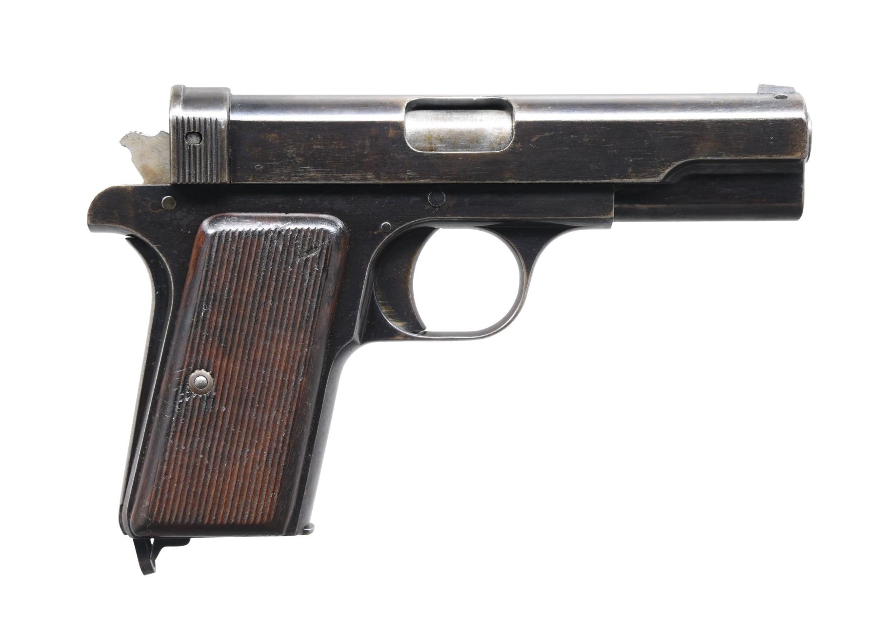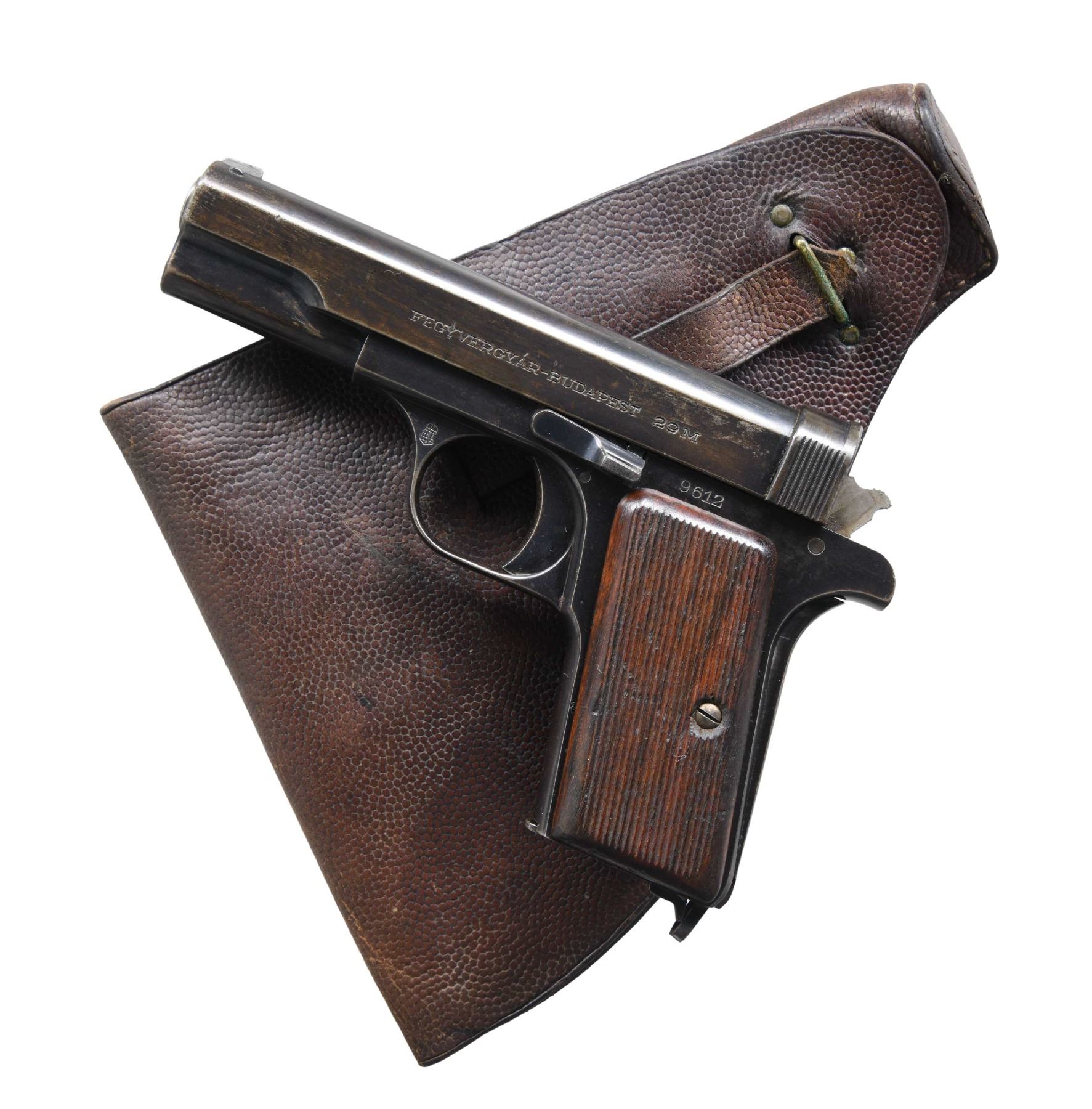 Cal. 7.65mm (32 ACP). S# 9612. Bbl. 4". Blade front sight. V-notch rear sight. Scarce Hungarian 29M pistol made 1929-1935. Early pistol with "FEGYVERGYÁR BUDAPEST 29M" marking on left side of slide. Left front of trigger guard has Hungarian military acceptance stamp. Blued finish. Grooved hardwood grips. MAGS: 1-7 rd. marked "29M" on floorplate. UNATTACHED ACCESSORIES: aftermarket black hardcase with pebbled leather Hungarian holster. CONDITION: grips show scattered dings & handling marks. Metal retains 60% original blue with overall fading to brown, some light dings & light oxidation. Action functions properly when hand cycled. Bore shows scattered frosting & light pitting but strong rifling. (24-6882/MJC). CURIO. $350-550.