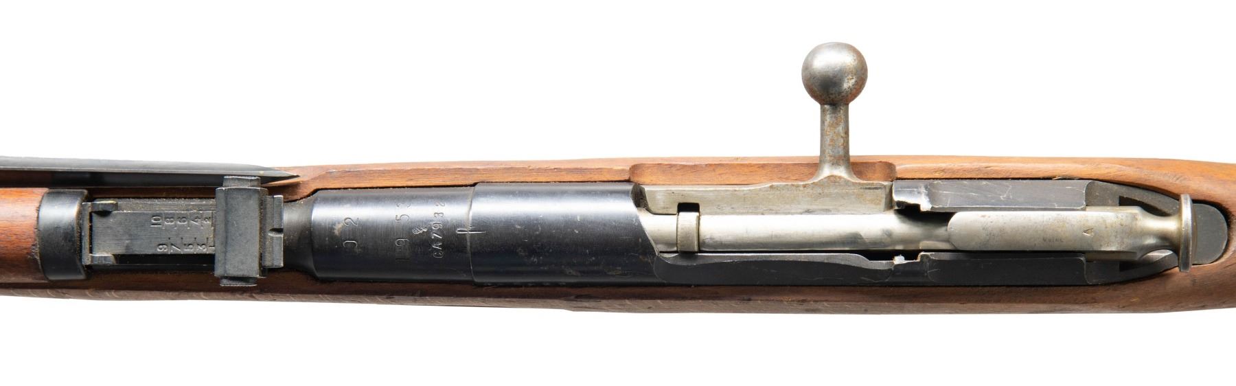 Cal. 7.62x54R. S# CA7932. Bbl. 20 1/2" with Century import marking. Post front sight with hood. Tangent rear sight graduated to 1000m. Bbl. shank & buttplate are matching, other parts are mismatched. Bbl. shank has 02 Hungarian marking & 1953 date. Left side of receiver has importer added serial number. Blued finish. Folding spike bayonet present. Beech stock set with Hungarian "02" marking & bottom mounted sling slots. Cleaning rod present. CONDITION: stock set shows scattered staining, dings & handling marks. Metal retains 80% arsenal blue with scattered oxidation spots, edge wear, handling marks, thinning & fading. Action functions properly when hand cycled. Bore shows scattered dried grease, oxidation & pitting but evident rifling. (25-3796/MJC). CURIO. $200-400.