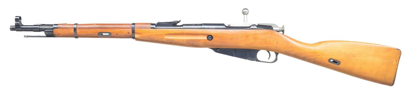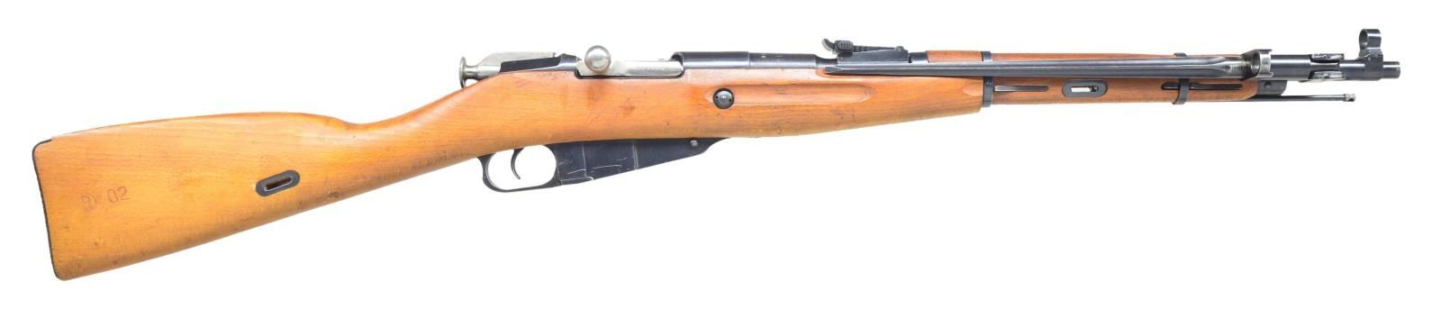 Cal. 7.62x54R. S #CA8530. All #s match. 20 1/2" Bbl. with import marking on left side. Bbl. top has "02" arsenal markings with 1953 date and S #. Left side of receiver has importer added S #. 14" folding spike bayonet. Tangent rear sight graduated to 1000 meters. Protected post front sight. Has cleaning rod. Beech hardwood stock with circled "B" and 02 markings. CONDITION: beech stock shows handling marks and some light dings. Metal retains 95% original blue with some high edge wear, handling marks and light oxidation on buttplate. Very good bright bore. (22-2524/MJC). CURIO. $100-200.