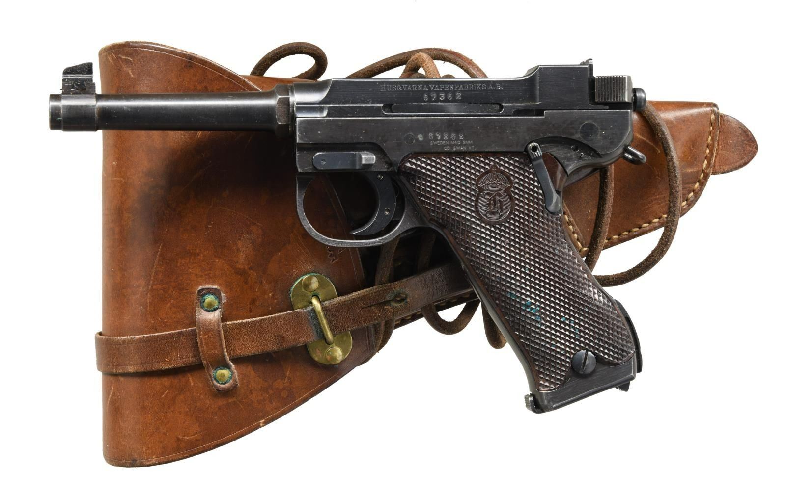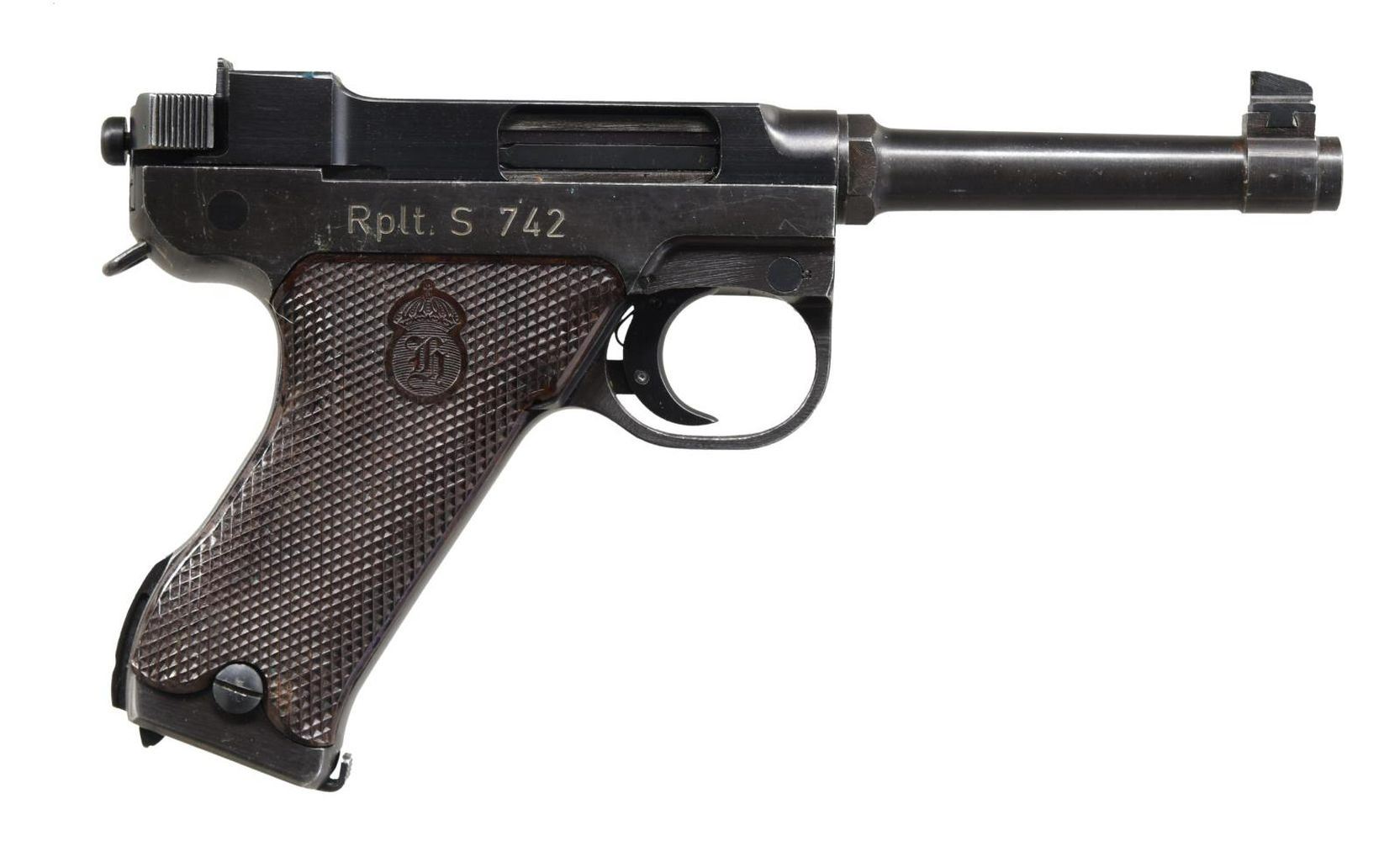 Cal. 9mm Luger. S# 67362. Bbl. 4 3/4". Blade front sight. U-notch rear sight. Right side of frame has "Rplt. S 742" police marking. CDI import marking on left side of frame. Matching numbers on slide & frame. Blue finish. Very good mechanics when cycled by hand. Stock lug present on backstrap. Checkered black grips w/ Husqvarna logo. MAGS: 3-8 rd. UNATTACHED ACCESSORIES: leather holster, cleaning rod & takedown tool. CONDITION: grips show a few flattened points & some handling wear. Metal retains 65% arsenal blue w/ a few light dings, scattered light scratches & fading to brown. Very good bore. (23-5753/MJC). CURIO. $800-1200.