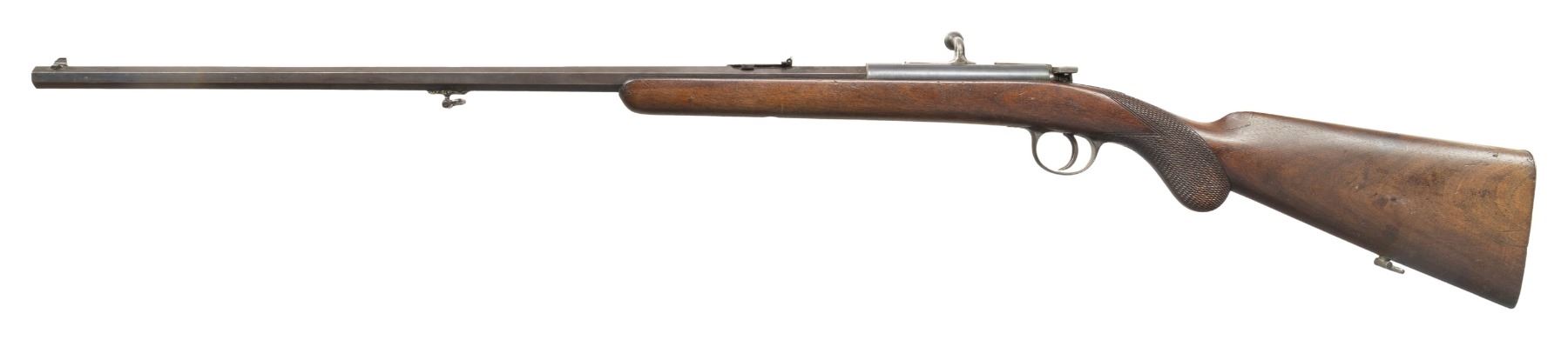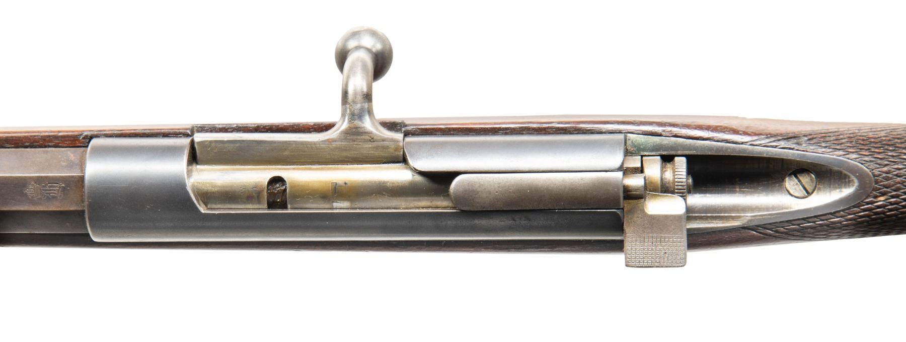 Cal. 7.65mm (32-20 WCF). S# 6324. Oct. 25.25" bbl. Sporting sights with added white paint. Mauser 1871 style action w/ wing safety. Checkered walnut stock w/ rnd. knob pistol grip & steel buttplate. CONDITION: fair fading blue mixing with brown patina shows light scratches & scattered spots of pinprick patina. Balance of wood finish has good appearance with numerous dings; area of sanding & refinish right side grip. Good shallow rifling with scattered light pitting. PROVENANCE: Estate of Groves Herrick. (25-6145/MD). CURIO. $200-300.