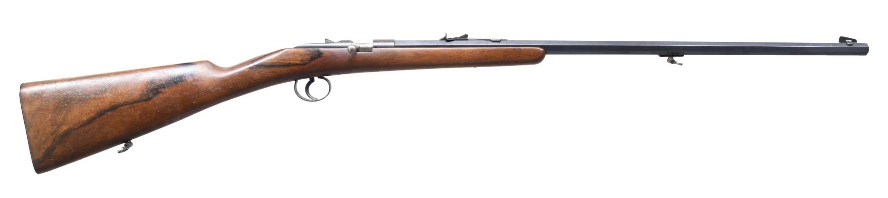 Cal. 22 LR. S# 50899. Oct. 24.5" barrel. Sporting sights. Walnut stock with steel buttplate & swivels. CONDITION: good showing handling marks throughout. Shiny bore with strong rifling. (24-6984/MD). CURIO. $200-400.