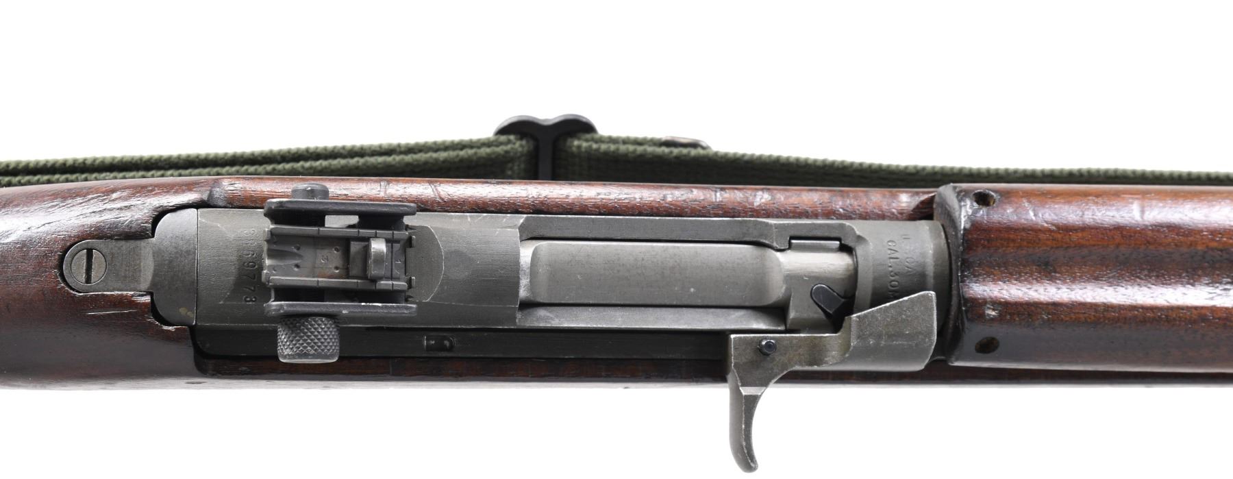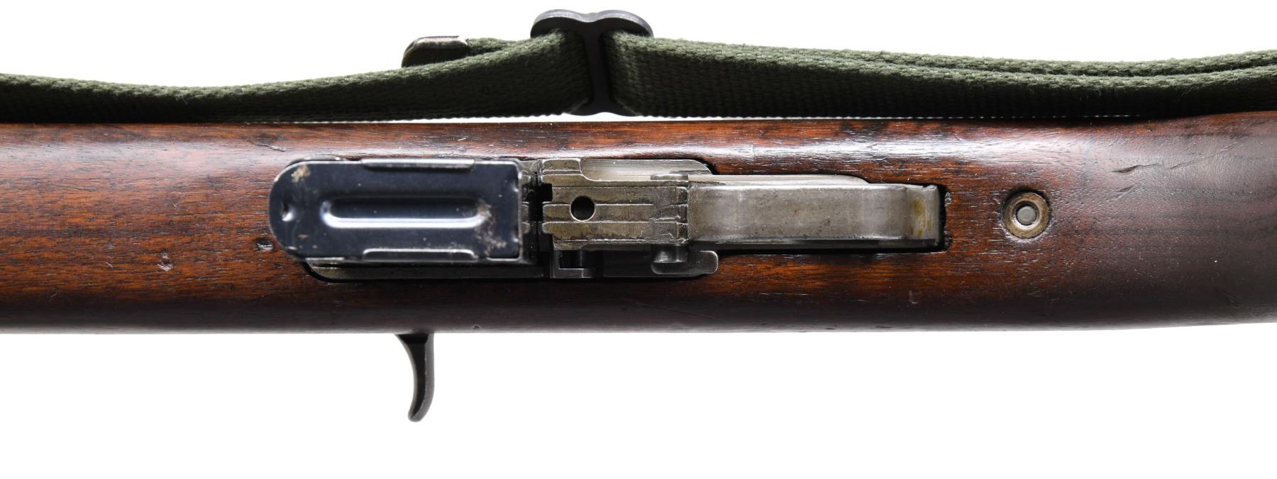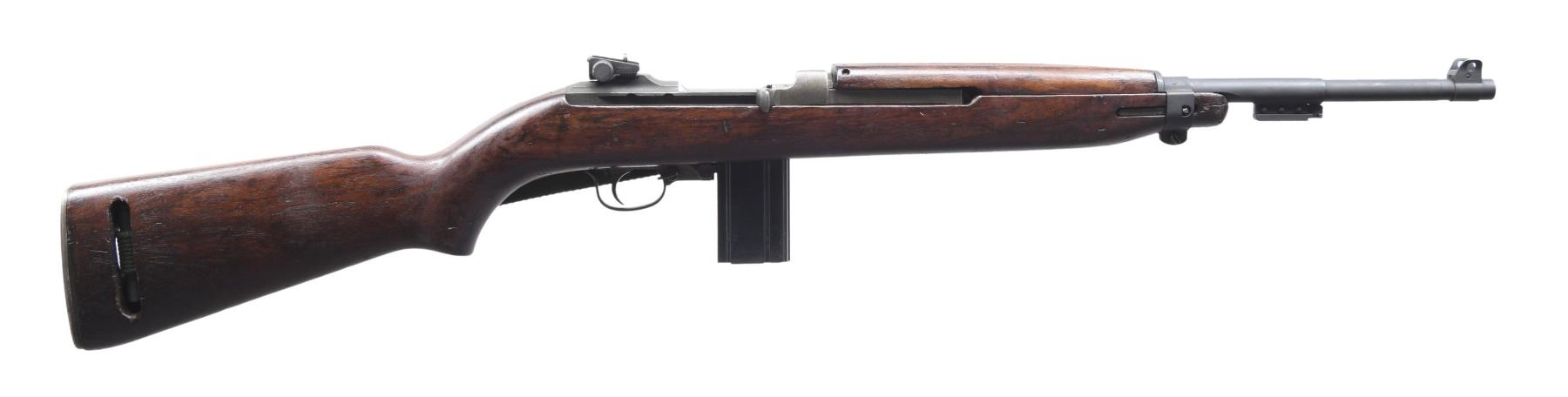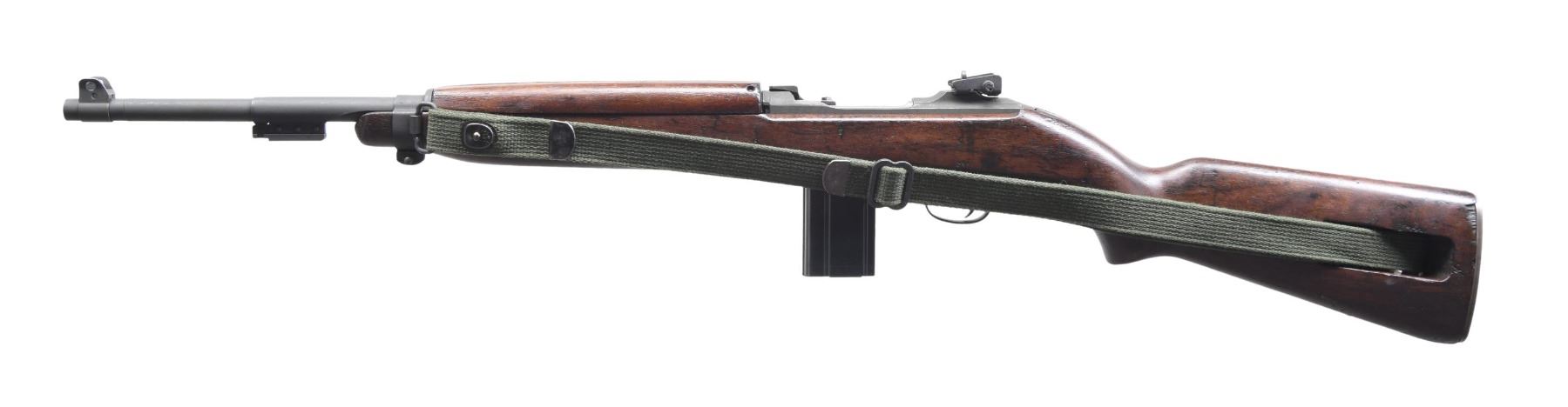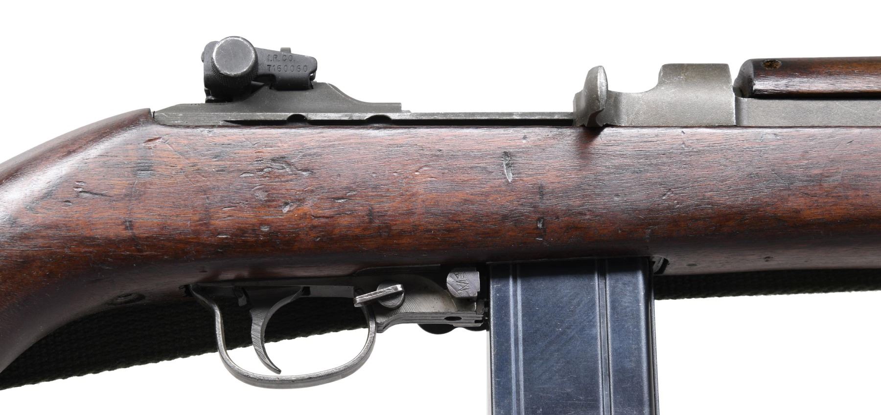 Cal. 30 Carb. S# 3869773. Bbl. 18", IBM undated. Unmarked blade front sight with protective ears. Stamped, "IR"-marked adjustable aperture rear sight. Flat, parkerized bolt, marked "AOB" on the right lug. Third variation operating slide, marked "AOB". Trigger housing, marked "BE-B" on the right side. "WMB"-marked straight hammer. "CM"-marked rotating safety. "WA"-marked mag. release. Third-type band, marked "KI" on the left side, with bayonet lug. "PR-B"-marked recoil plate. Walnut, low wood stock set with left side sling provisions, canvas sling, and "BR-B"-marked sling cut. Bottom of pistol grip has faint white paint rack number. Two-rivet handguard, marked "BR-B". MAGS: two 15 rd.; one mag. is marked "S-E" and the other "UI". UNATTACHED ACCESSORIES: GI canvas muzzle cover, marked "U.S." and "ROBEY TACKLE 1944". CONDITION: stock set has an arsenal rework-type finish, with some chipping around the butt, a few paint stains, scattered dings, a flaking oil finish, and handling marks. Metal retains 85% of its arsenal-reworked parkerized finish with some edge wear and fading, most notably on bottom metal. Action functions properly when hand-cycled. Bright, near very good+ bore. (24-5807/MJC). CURIO. $500-800.