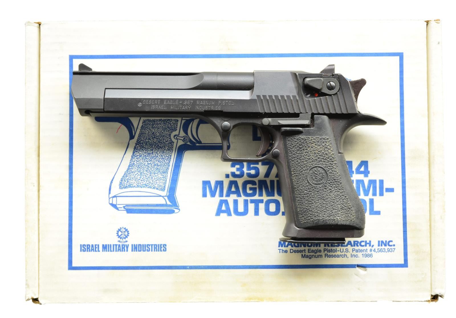 BOX. Cal. 357 Mag. S# 31062. Bbl. 6 1/4". The classic Desert Eagle branded long ago by Hollywood & the alternative music community as the "Deagle", this example chambered in the powerful 357 Mag. loading. Matte black frame. Fixed blade front sight. Drift adj. rear sight. Traditional single action, gas operated mechanism w/ rotating bolt to tame the otherwise uncomfortable recoil. Ambidextrous safety on rear serrated slide. Factory plastic wrap around pistol grips. Front beveled mag. well. MAGS: 1-9 rd. factory. UNATTACHED ACCESSORIES: Magnum Research factory box, armorer’s tool, cleaning kit, factory owners manual, paperwork. CONDITION: finish coverage is correct & complete w/ gentle thinning at some high spots, primarily around muzzle. It doesn't appear to have been utilized a great amount. Bore is shiny w/ polygonal rifling as it should be. Fire control mechanism appears to function correctly when cycled by hand. (21-643/JZ). MODERN. $600-900.
