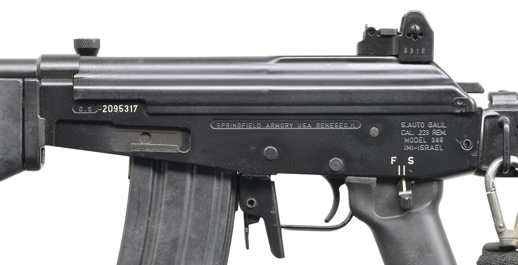 Cal. 5.56/.223 S# GS-2095317. Bbl. 16". Conceived following the 1967 war when Israel was looking for a lighter alternative to the FAL rifle. It was based heavily on the AK-47 design, which the Arab armies had utilized and had been determined to have performed well. It was expanded upon by adding other features such as a folding bipod to some models to increase stability and provide reasonable consistency under automatic fire, which also doubles as a wire cutter. A right side folding shoulder stock was utilized to be more useful to the mechanized units which required shorter platforms to fit inside vehicles. This particular rifle was manufactured by Israeli Military Industries & imported by Springfirld Armory of Geneseo, IL. It has a threaded barrel, terminated w/ the proper factory flash hider. Hooded post front sight w/ flip up night sight. Protected dual aperture rear sight w/ flip up night sight. Ambidextrous safety / selector & magazine release. Scope mount slot on milled receiver. Left side sling swivels, currently sporting black nylon sling. Right side folding stock. Black plastic forend. MAGS: 1 steel 30 rd. UNATTACHED ACCESSORIES: Factory box. CONDITION: Finish coverage complete & consistent w/ little sign of use aside from a areas of mechanical intervention. Bright bore w/ strong rifling. Night sights no longer illuminate. Fire control mechanism appears to function correctly when cycled by hand. PROVENANCE: Lifelong Collection of Terrence McCarty. (24-555/JZ). MODERN. $2,500-4,500.