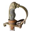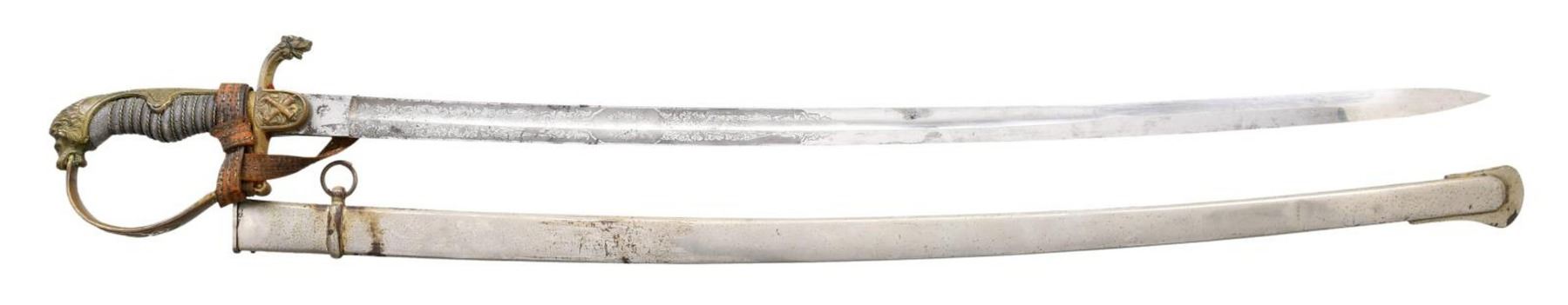 Overall length: 41”. Blade length: 32 3/4". Blade has a single wide fuller and is etched on the spine “MOHR & SPEYER BERLIN”. The blade is etched over 14” w/ various patriotic & foliate motifs. Gilded brass hilt features a lion head quillon & crossed cannons on the front languet. The knuckle bow is embellished, and the pommel is a well-executed lion’s head. The backstrap is also decorated w/ foliate & geometric motifs. Wire-wrapped sharkskin grip. The remains of a knot strap are attached to the grip. Plated iron scabbard. CONDITION: blade has a light gray patina w/ scattered light spotting. Hilt shows traces of original gilded finish. Grip shows light overall wear. Scabbard retains 90% of original plating. (02-21252/BF). $250-400.