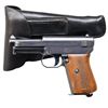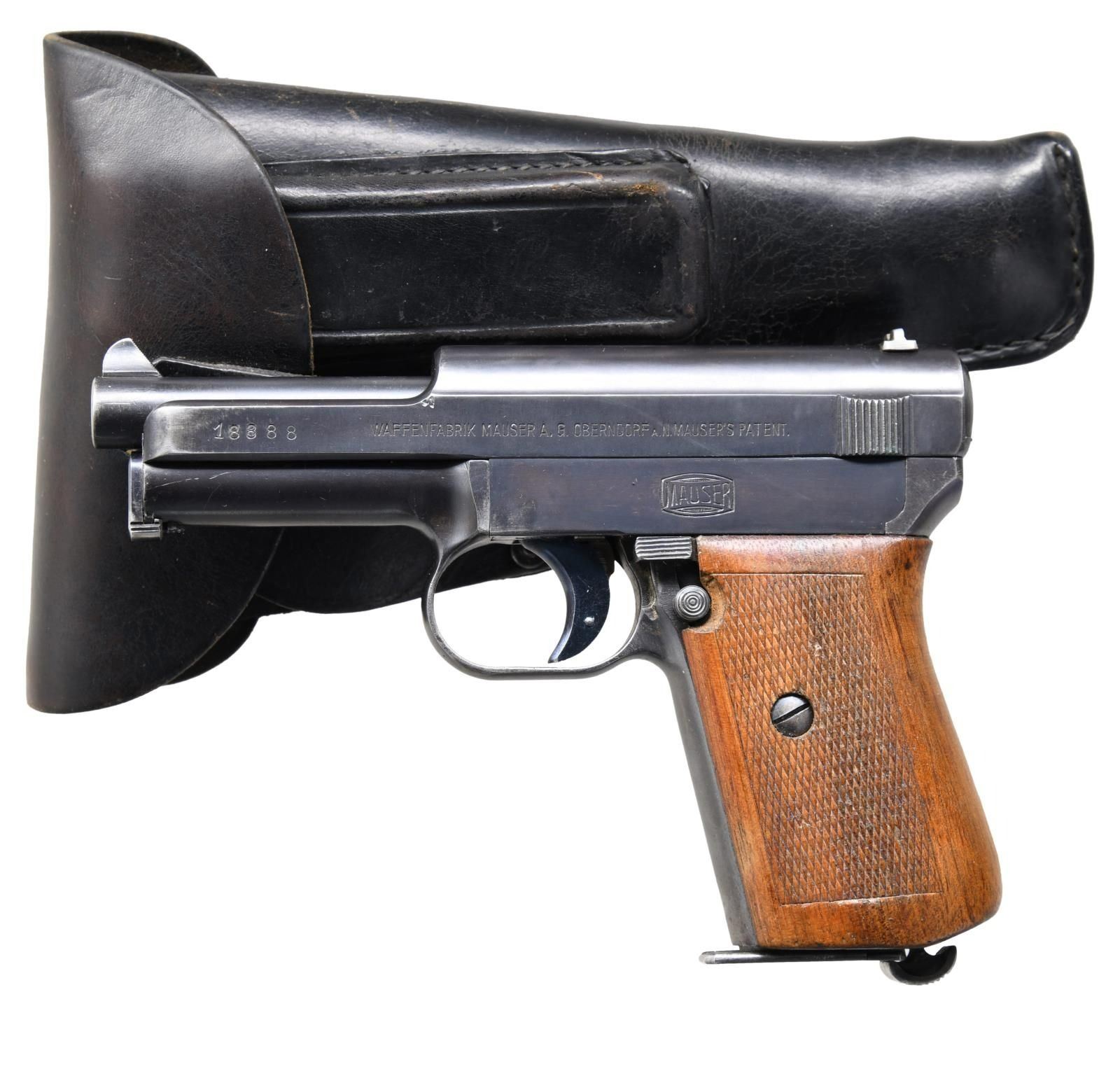PISTOL. Cal. 7.65mm (32 ACP). S# 18888. Bbl. 3 1/2". Blade front sight. U-notch rear sight. All the visible numbers match. Top of the slide has a WWI Imperial German acceptance stamp ahead of the rear sight and a crown "U" marking behind it. Blued finish. Checkered walnut grips. MAGS: 1–8 rd. UNATTACHED ACCESSORIES: 1918-dated JM Eckart black leather holster in good condition. CONDITION: grips show some light chipping forming on the right panel, dings, and handling wear. Metal retains 70% of its original blue with scattered edge wear & fading. Very good, bright bore. (24-1092/MJC). CURIO. $400-600.