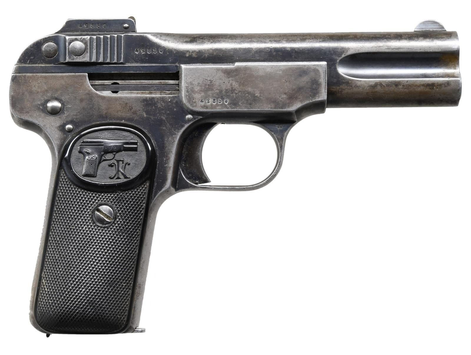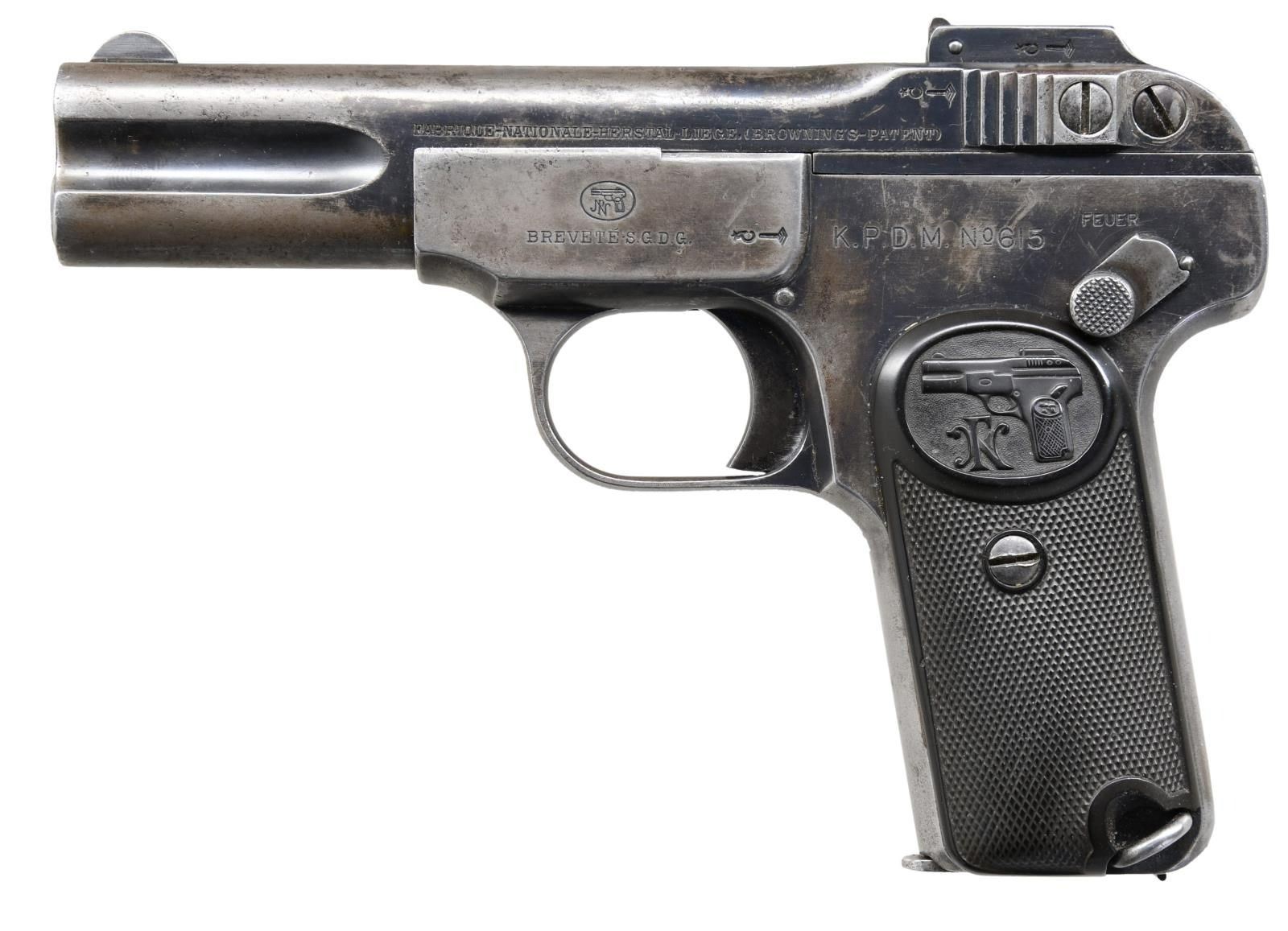 PISTOL. Cal. 7.65mm (32 ACP). S# 42850. Bbl. 4". Round blade front sight and V-notch rear sight. All visible matching numbers. The right side of the frame has an Imperial German police marking that reads "K.P.D.M. No 615." Blue finish and checkered black hard rubber grips with the FN 1900 logo. The left side of the grip frame has a lanyard ring. MAGS: 1–7 rd., unmarked, that shows scattered pitting & wear. CONDITION: grips show some dings, flattened points, and handling wear. Metal is mostly a dull gray patina with scattered traces of original blue, some light pitting, minor dings, and oxidation. Fair bore with some scattered frosting and light pitting. PROVENANCE: from the lifelong collection of Robert "Mike" Bricker. (24-1045/MJC). CURIO. $400-600.